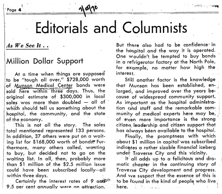 Newspaper editorial. $728,000 worth of Munson Medical Center bonds were sold within three days.