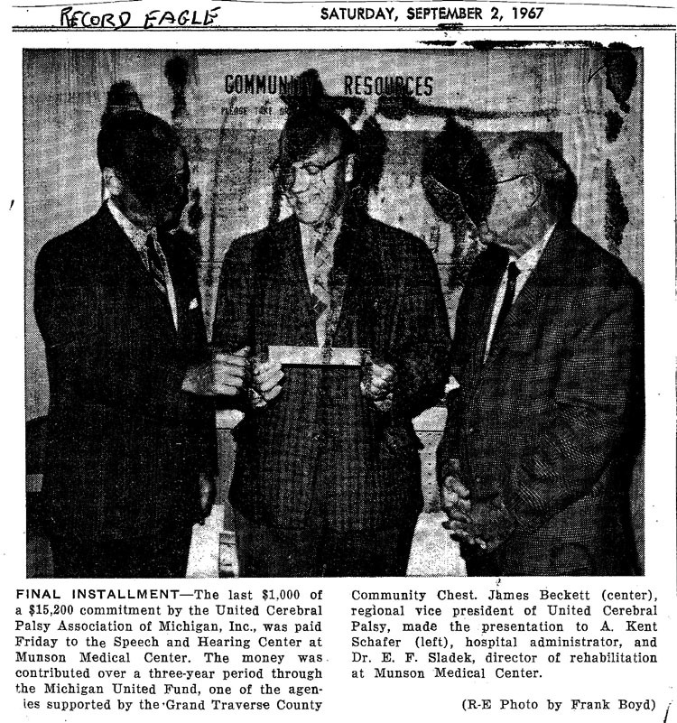 Newspaper photograph with caption - James Beckett (center) regional Vice President of United Cerebral Palsy, making the presentation to A. Kent Schafer (left), hospital Administrator, and Dr. E.F. Sladek, Director of Rehabilitation at Munson Medical Center. Speech and Hearing Department receive additional funding.