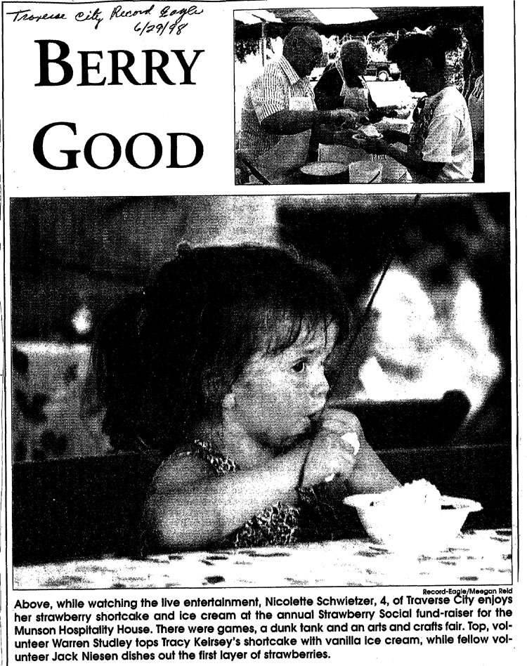 Newspaper photographs with captions: above, while watching the live entertainment, Nicholette Schwietzer, 4, of Traverse City enjoys her strawberry shortcake and ice cream at the annual Strawberry Shortcake fundraiser for the Munson Hospitality House. There were games, a dunk tank, and arts and crafts fair. Top, volunteer Warren Studley tops Tracy Keirsey's shortcake with vanilla ice cream, while fellow volunteer Jack Niesen dishes out the first layer of strawberries.