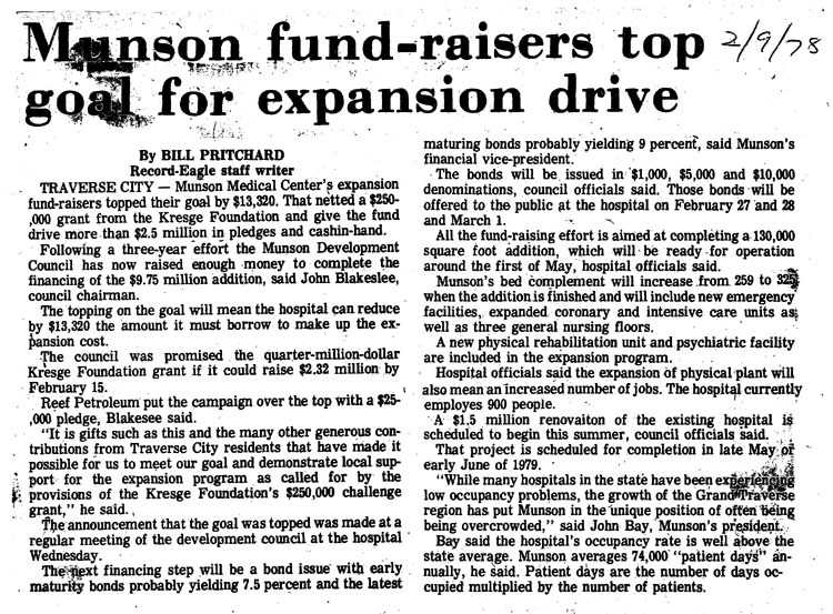 Newspaper article. A three-year fund drive results in a community-funded matching program. The effort will result in a 130,000 square foot addition which will increase bed capacity.