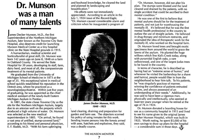 Article in quarterly newsletter with a photograph of James Decker Munson, M.D., the first superintendent of the Northern Michigan Asylum. Biographical information on James Decker Munson, M.D. plus the history of the State Hospital.