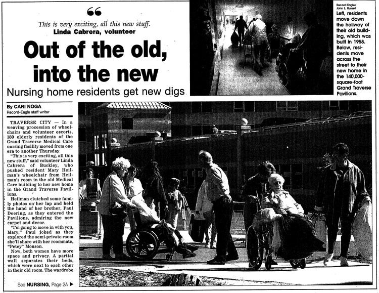 Newspaper article with photographs: left, residents move down the hallway of thier old building which was built in 1958. Below, residents move across the street to their new home in the 140,000 square-foot Grand Traverse Pavilions. The third photograph shows residents making their way into the new facility. 180 elderly residents and their volunteer escorts move out of the old Medical Care Building.