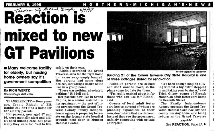 Newspaper article with pictures: Building 21 of the former Traverse City State Hospital is one of the three cottages slated for renovation. Second photo shows the exterior of one of the three former cottages on the grounds of the Grand Traverse Commons to become senior apartments. Many welcome facility for elderly, but nursing home owners say it's government competition. $23 million project offers a range of housing opportunities.