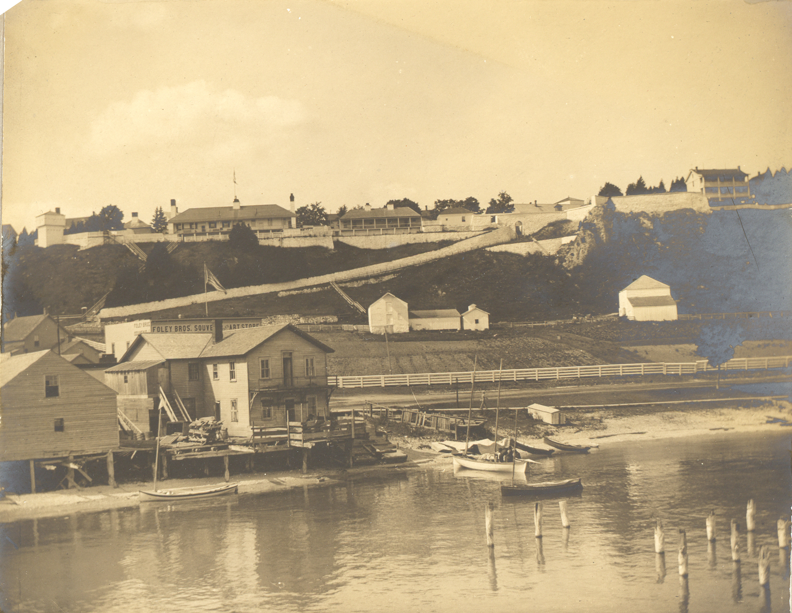 Photograph of Fort Mackinac, Michigan on Mackinac Island as seen from the lake.