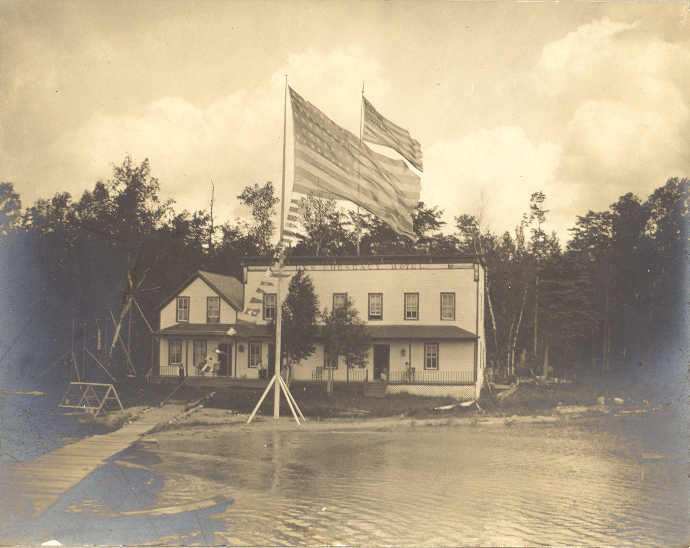 Photograph of the Les Cheneaux Hotel with American flags, beach and dock. "Les Cheneaux Hotel" is on the side front of the building.