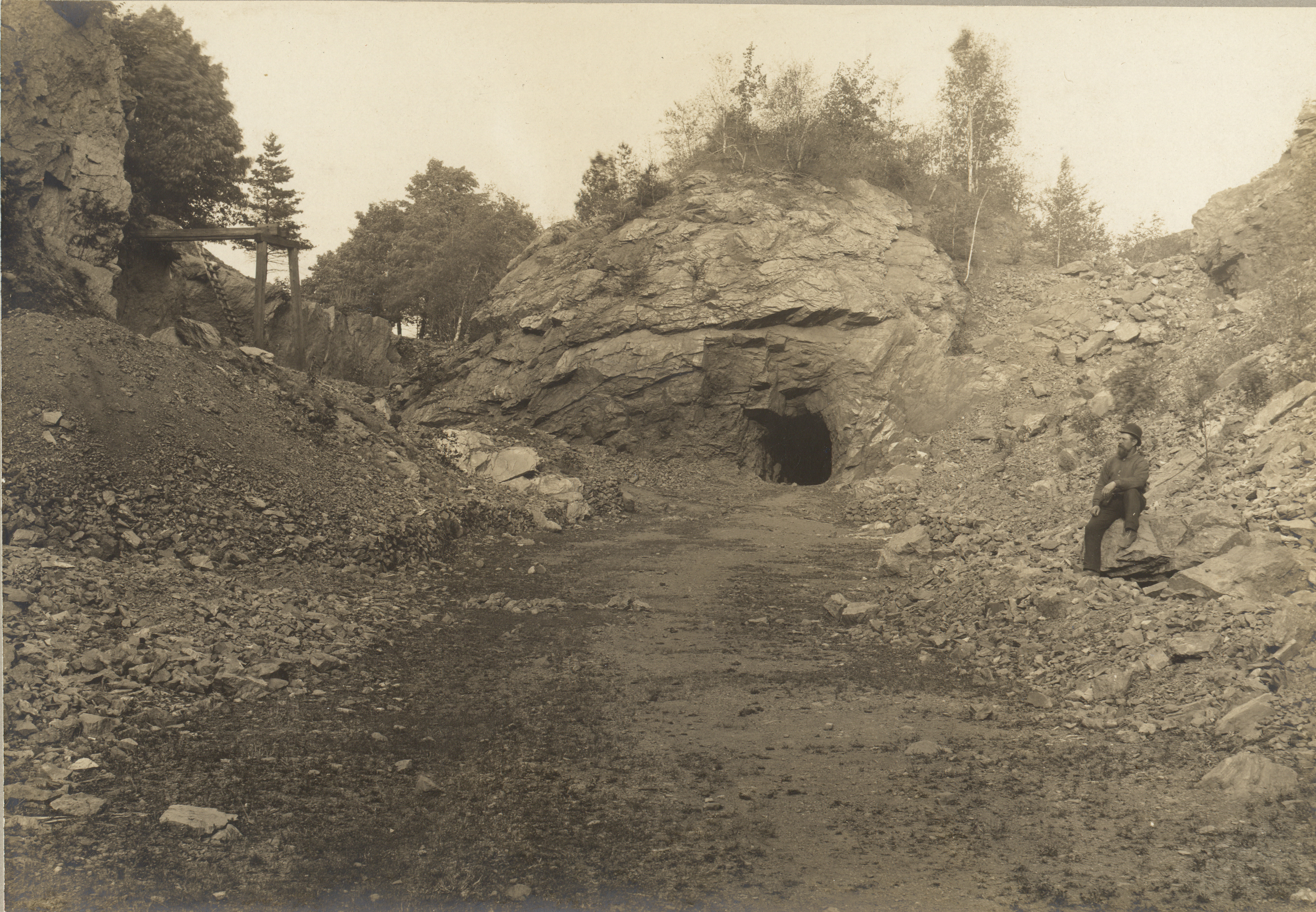 Photograph of the entrance into a mine in the Upper Peninsula with man in foreground.