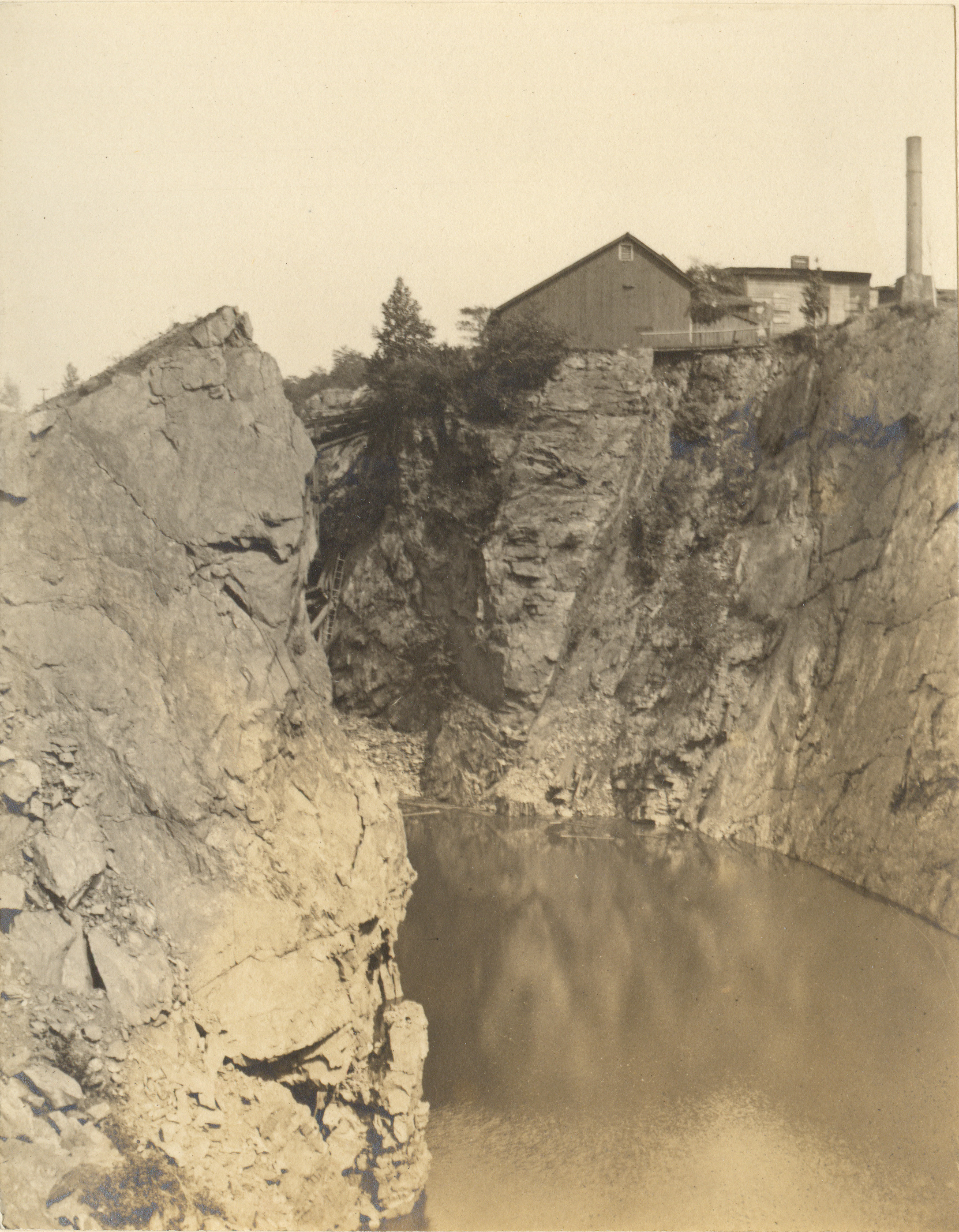 Photograph of mining facility located on a rocky cliff with lake below.