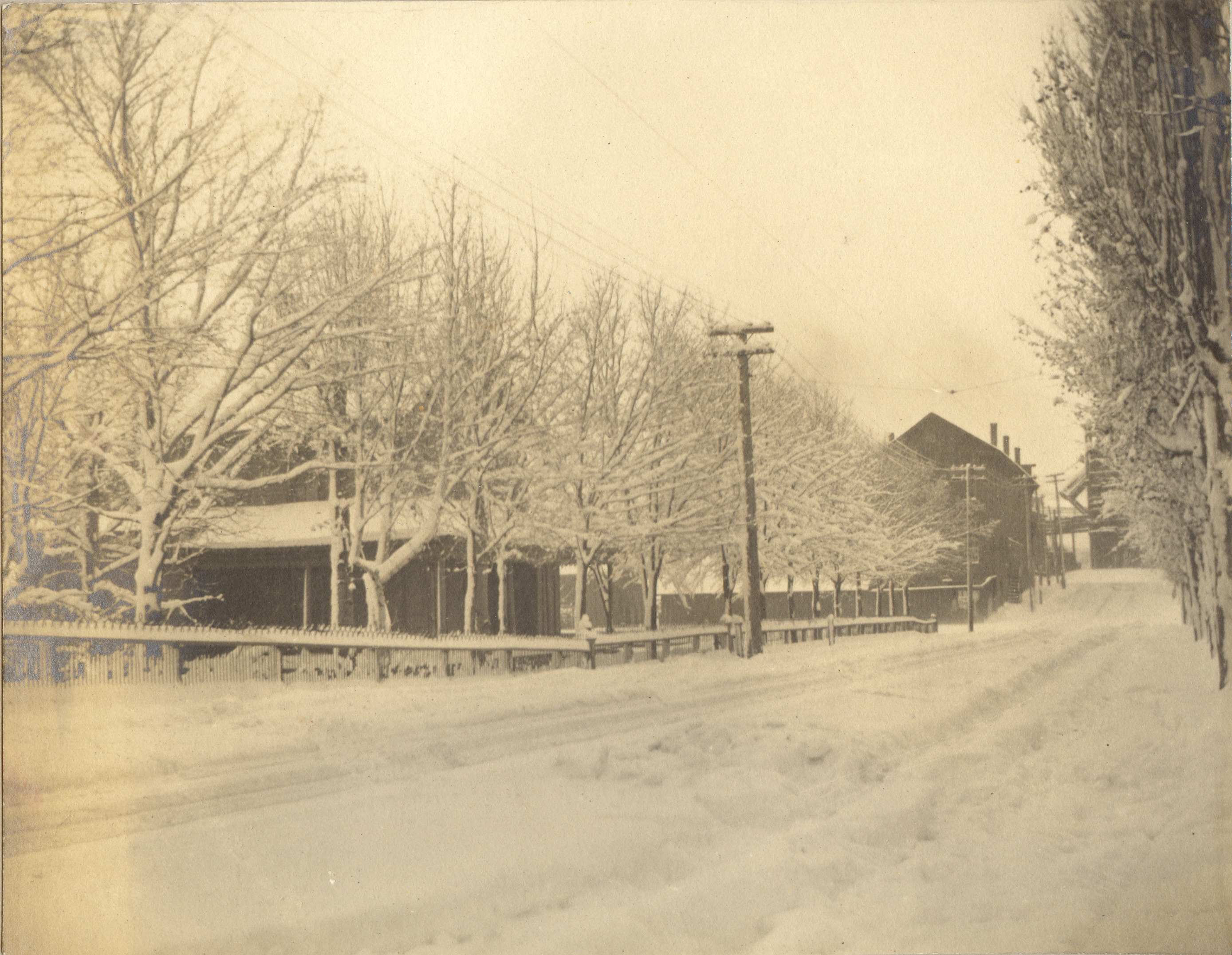 Photograph of a road in Negaunee with houses during the winter.