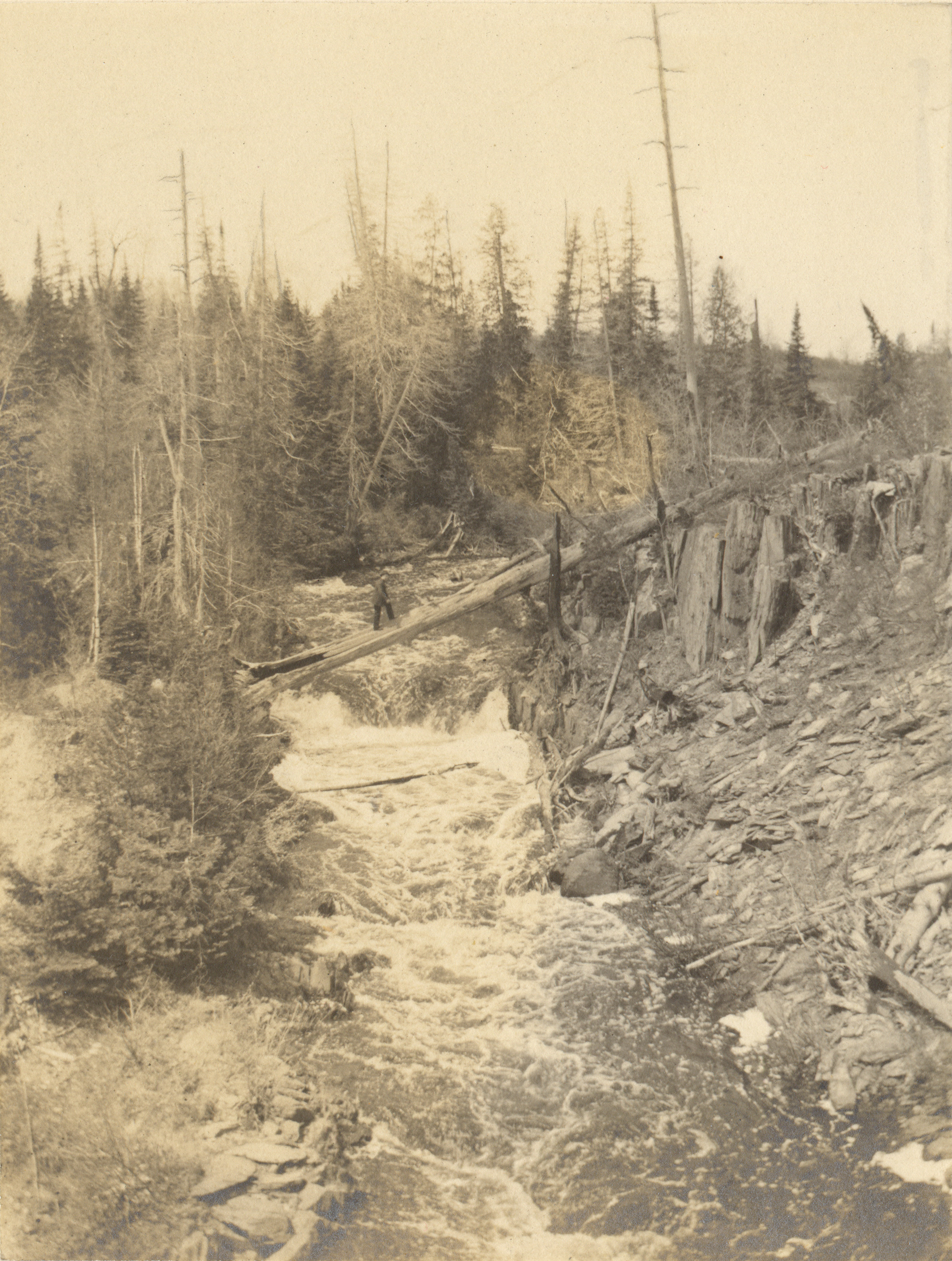 Photograph of a river and waterfall in the Upper Peninsula of Michigan. A person is walking on a tree that has fallen across the river.
