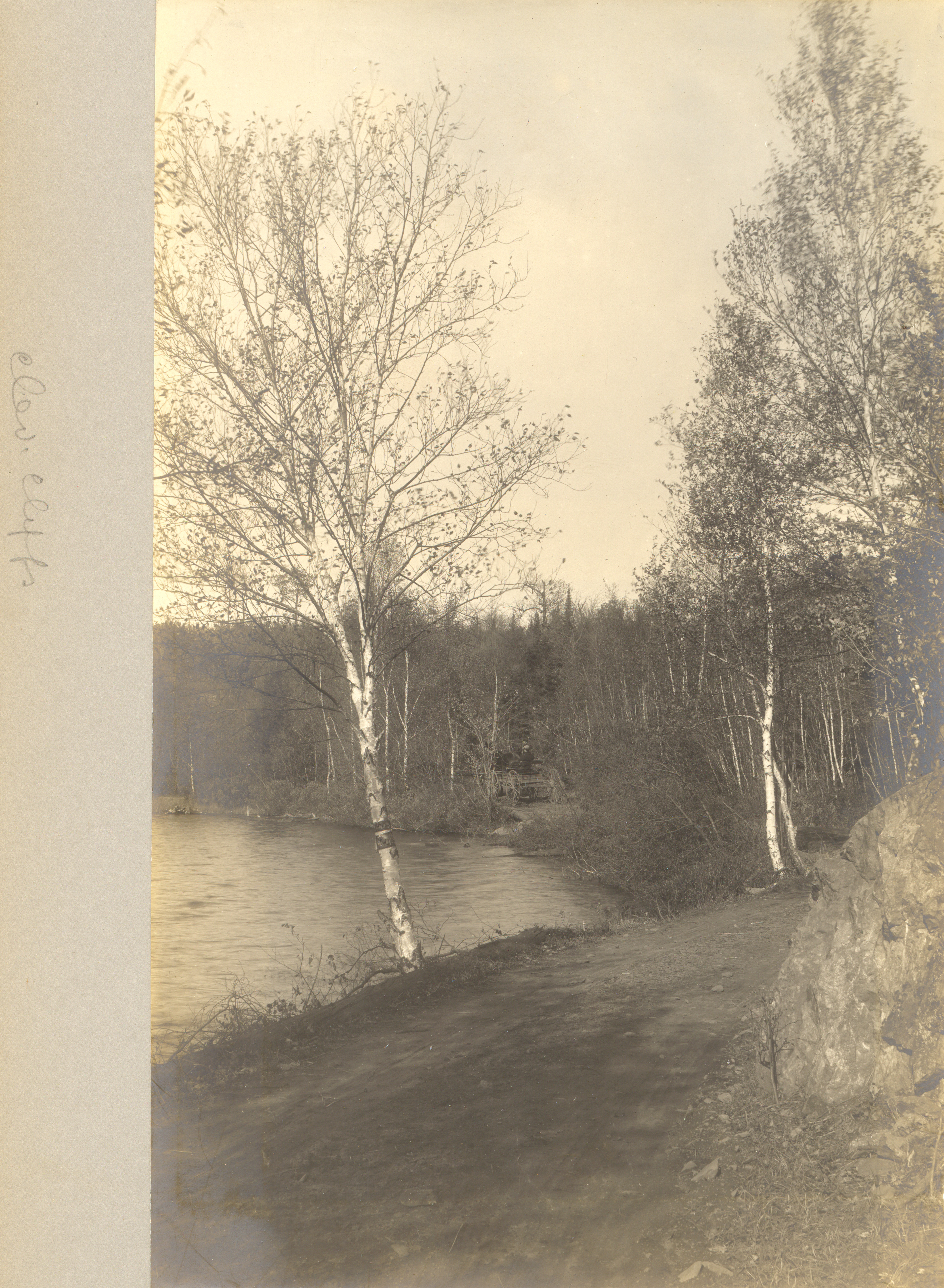 Photograph of road along a lake. "Clev. Cliffs" is handwritten on edge of background paper.