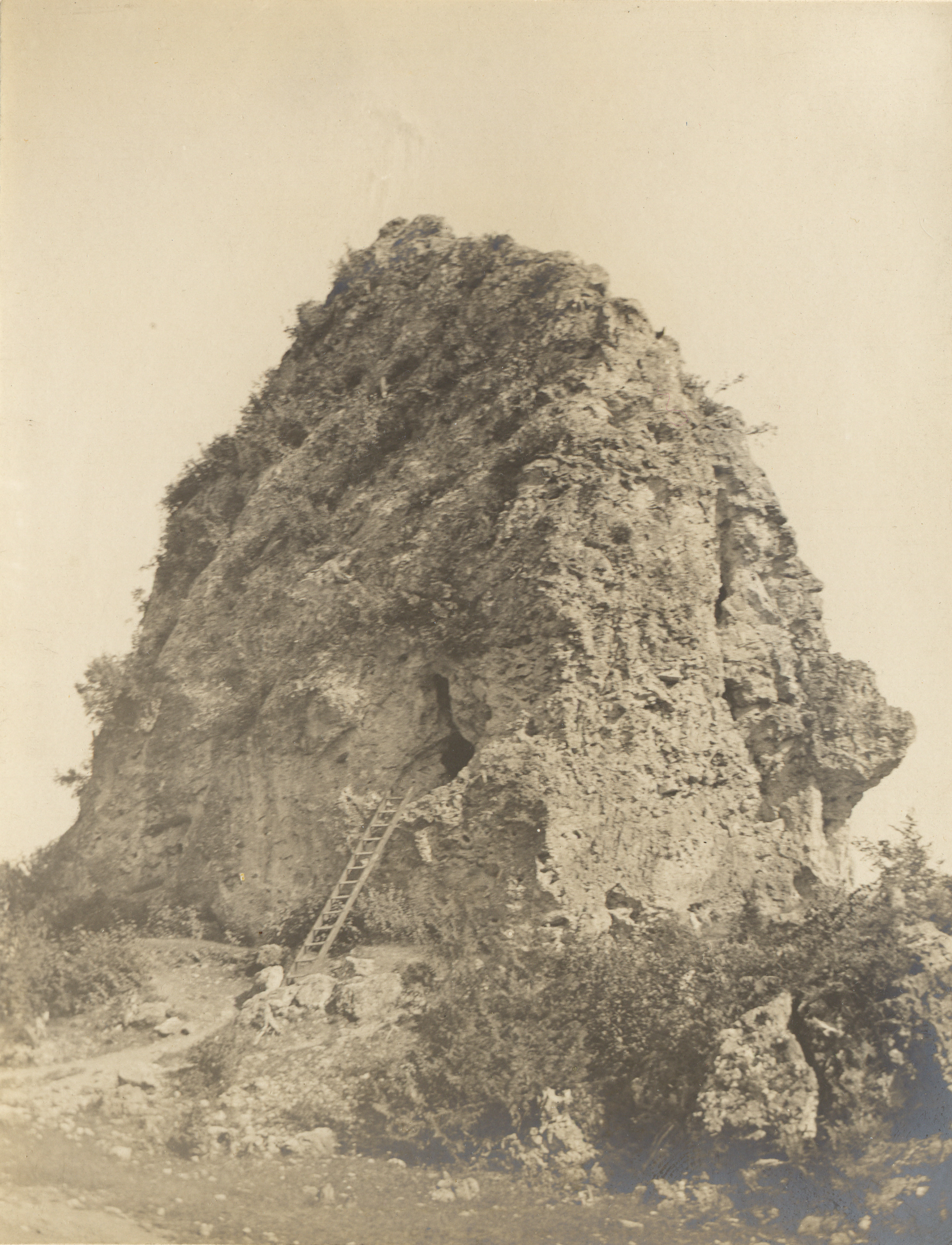 Photograph of a hole in a rock formation with a ladder leading toward hole.