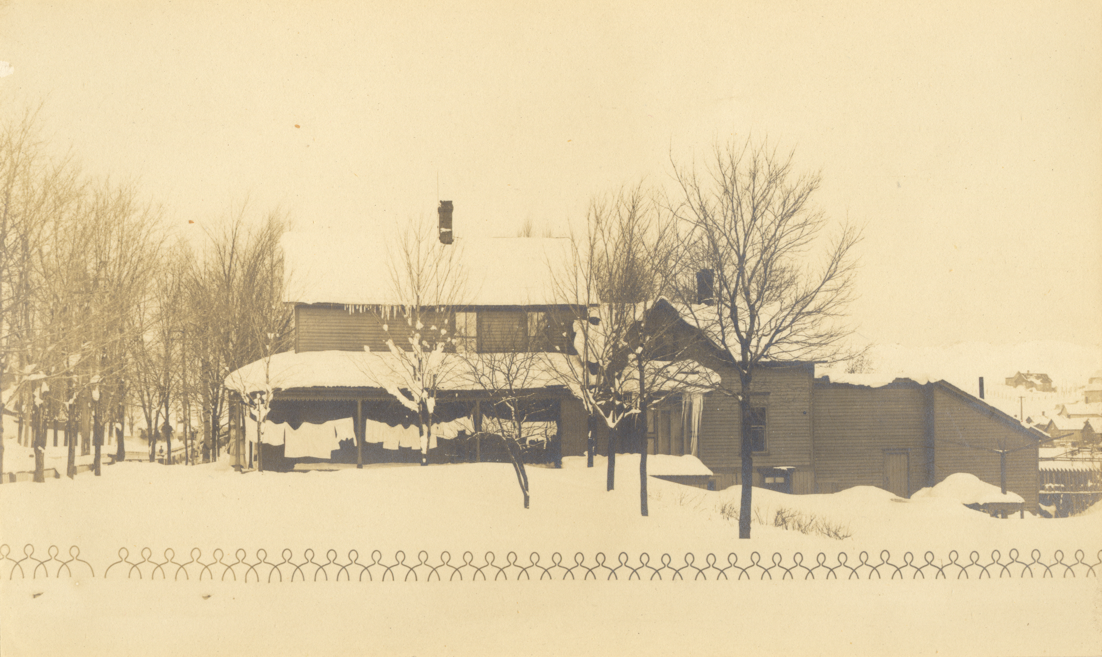 Photograph of a house in the winter with laundry hung out on the porch.