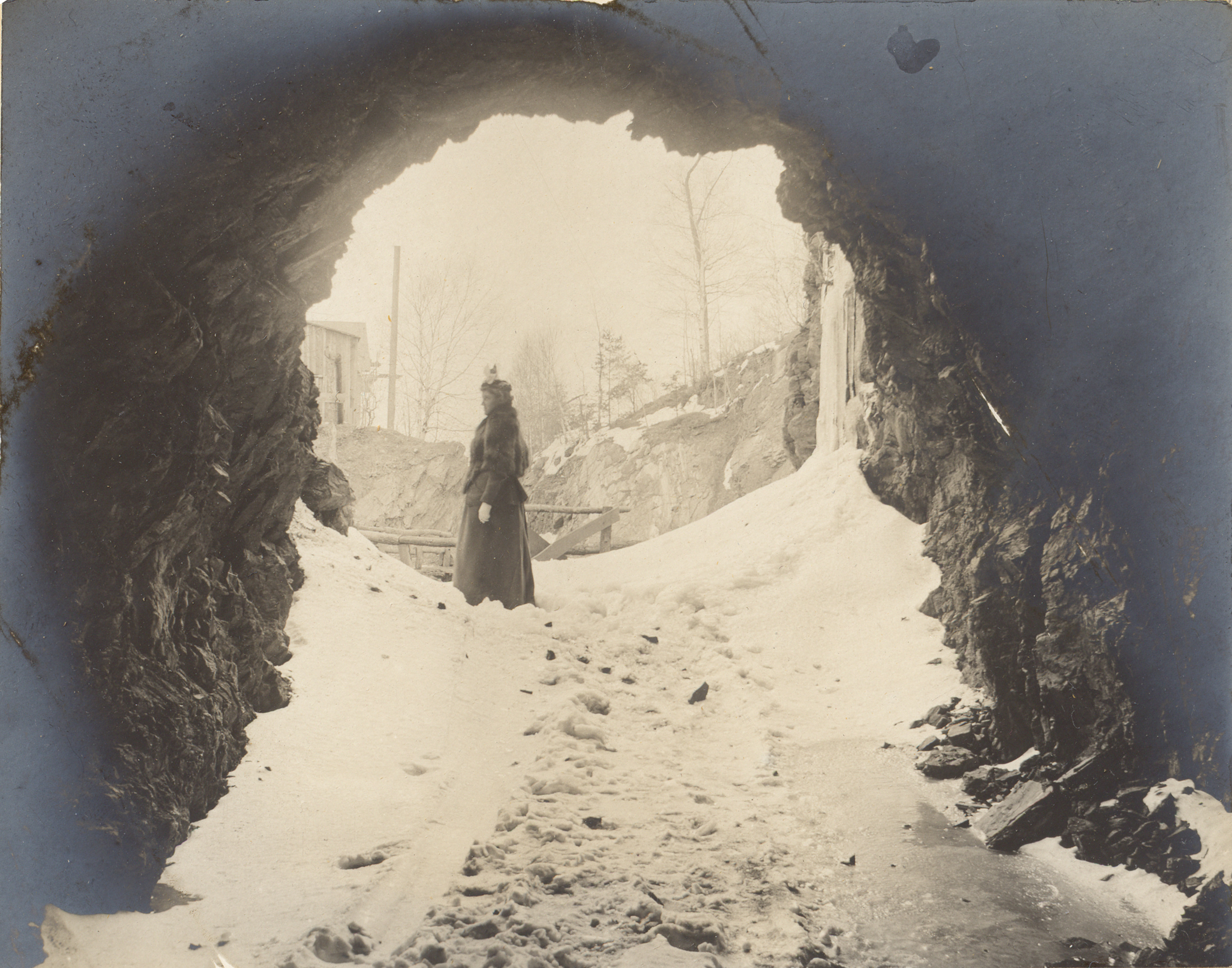 Photograph of a mining site in the Upper Peninsula of Michigan during the winter. A woman is framed in the entrance of a mine or cave.