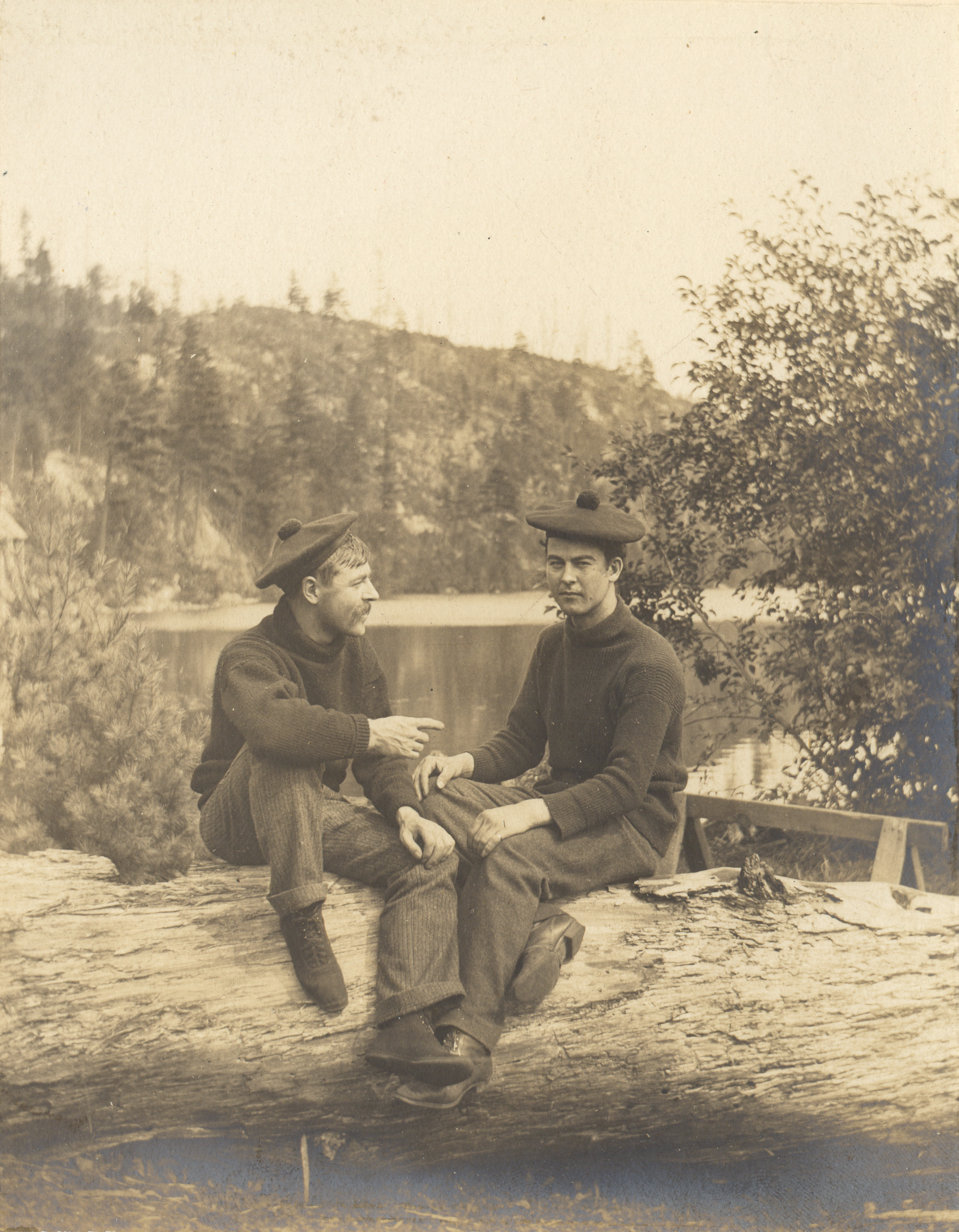 Photograph of two men wearing tams and are sitting on a log next to a lake.