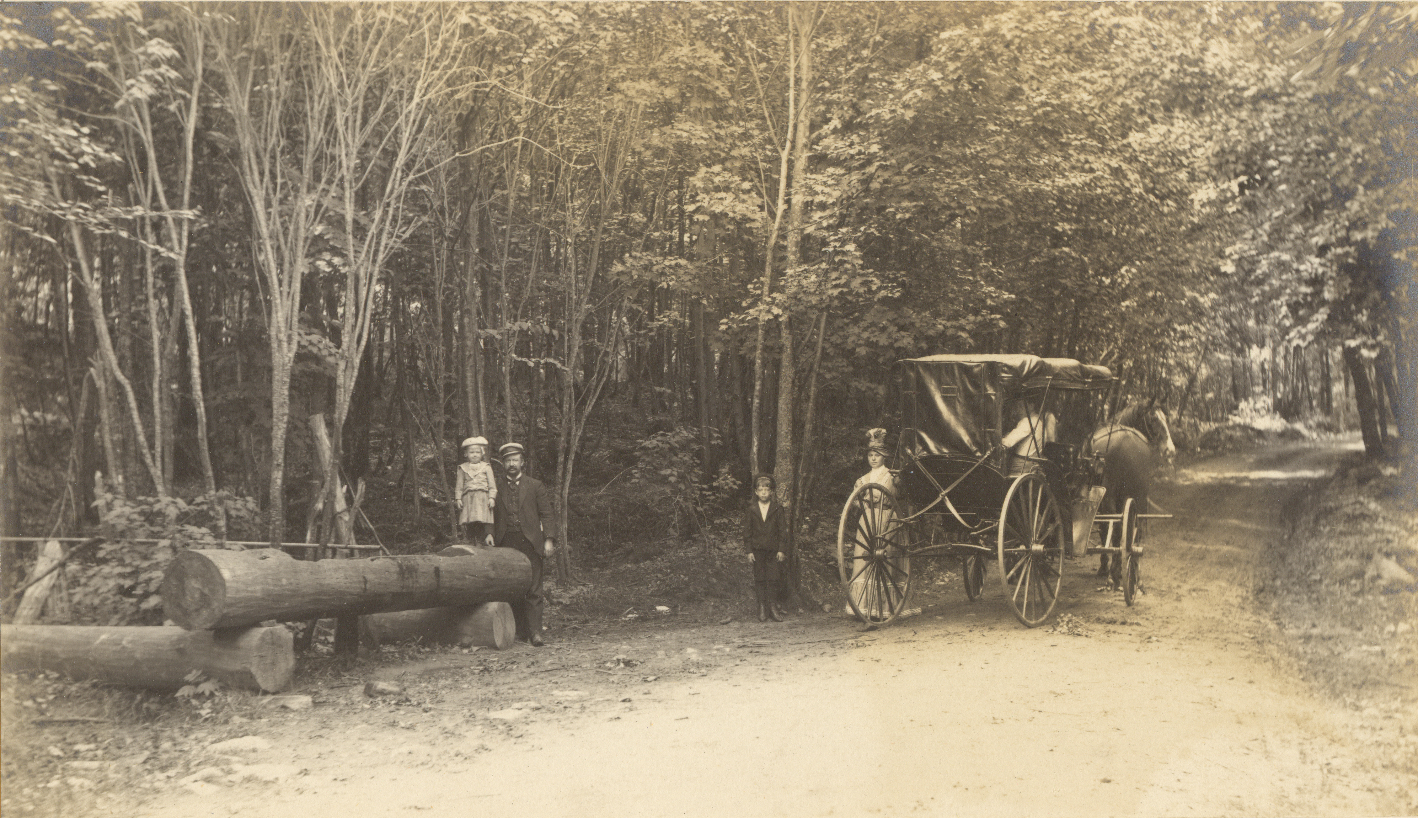 Photograph of a horse-drawn carriage on a dirt road. A man, woman, boy, and girl also appear in the image.