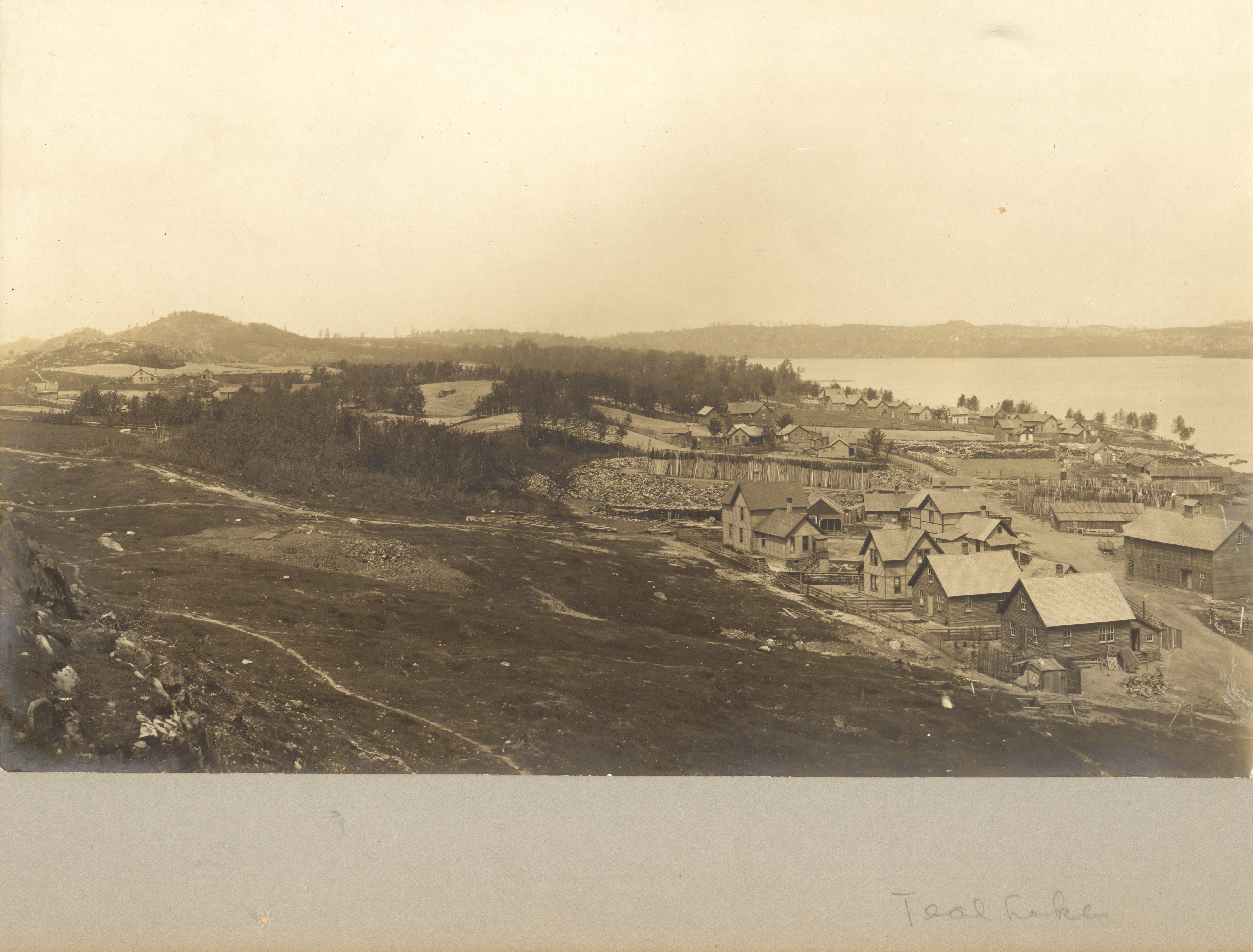 Photograph of houses along the shore of Teal Lake in Negaunee, Michigan. "Teal Lake" is handwritten at the bottom edge.