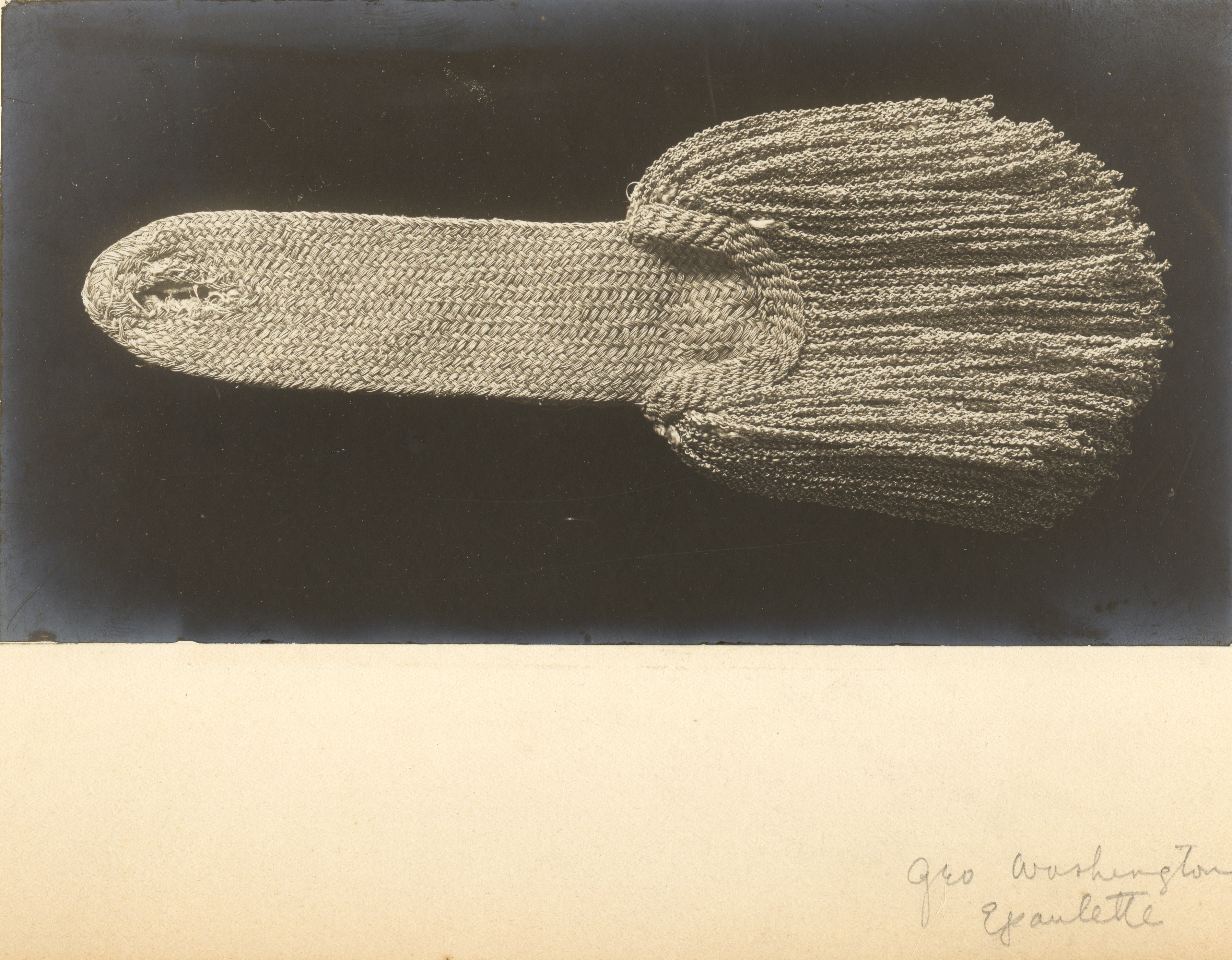 Photograph of an epaulette from George Washington's uniform. "Geo Washington Epaulette" is handwritten at the bottom edge.