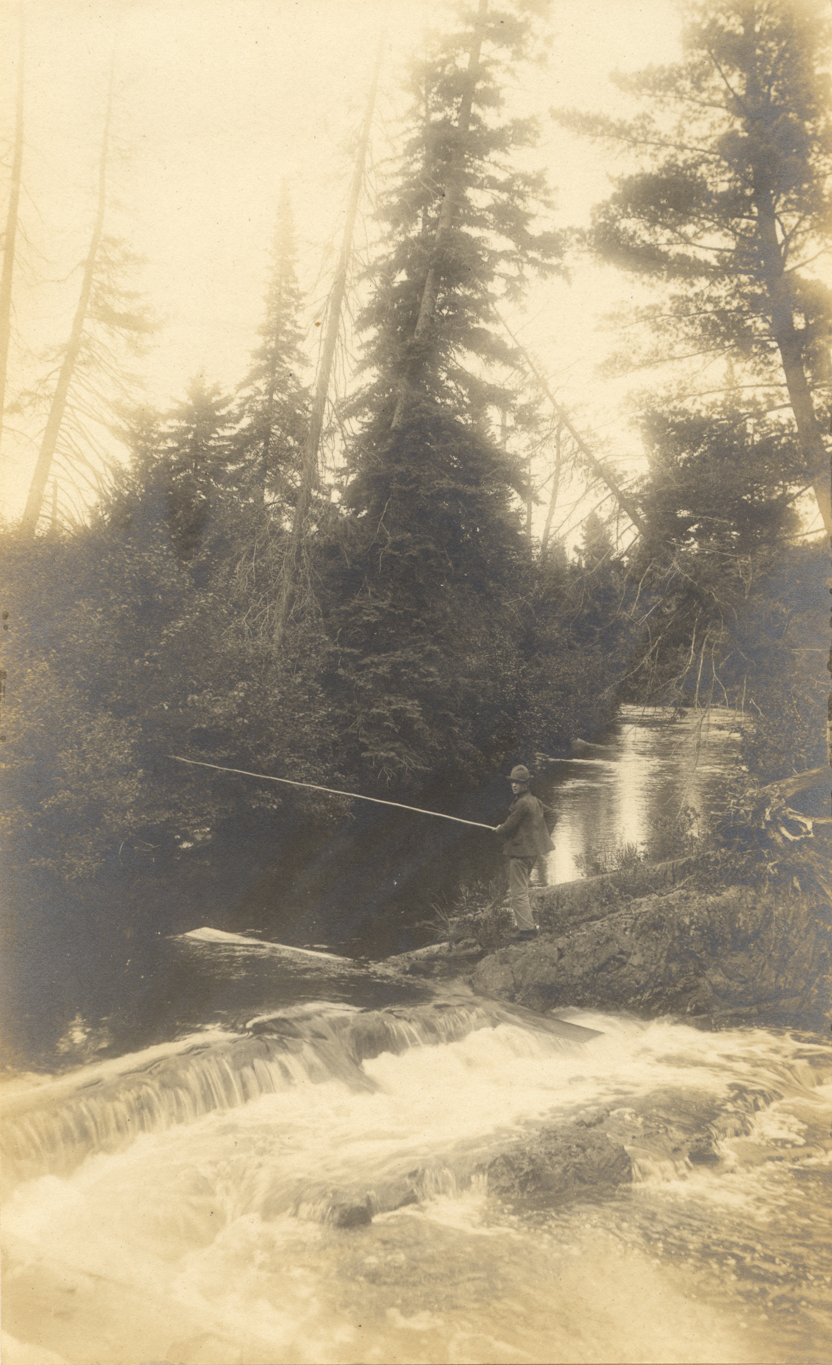 Photograph of a man fishing near river rapids in the Upper Peninsula of Michigan.