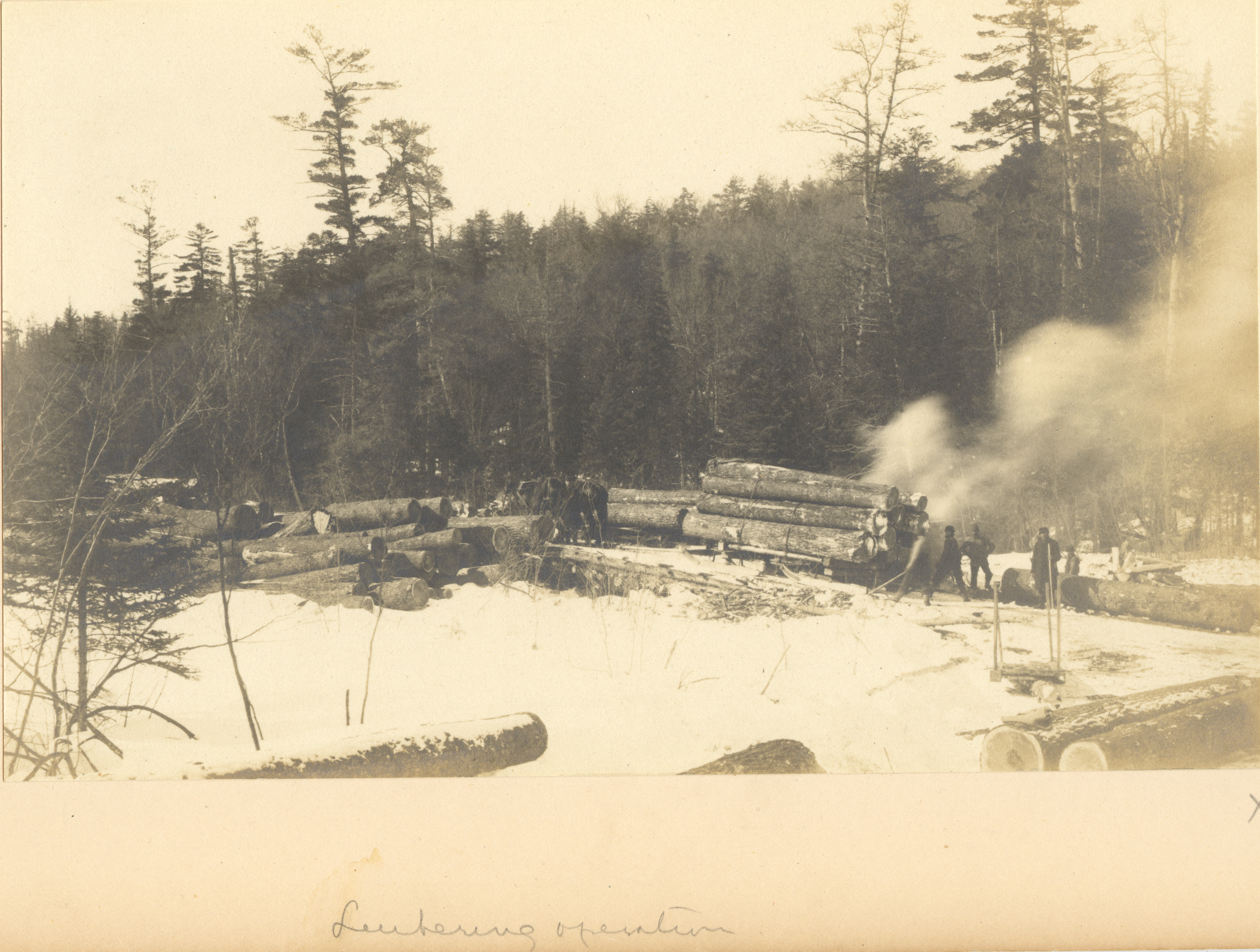 Photograph of a lumbering operation in the winter in the Upper Peninsula of Michigan. "Lumbering operation" is handwritten at bottom edge.