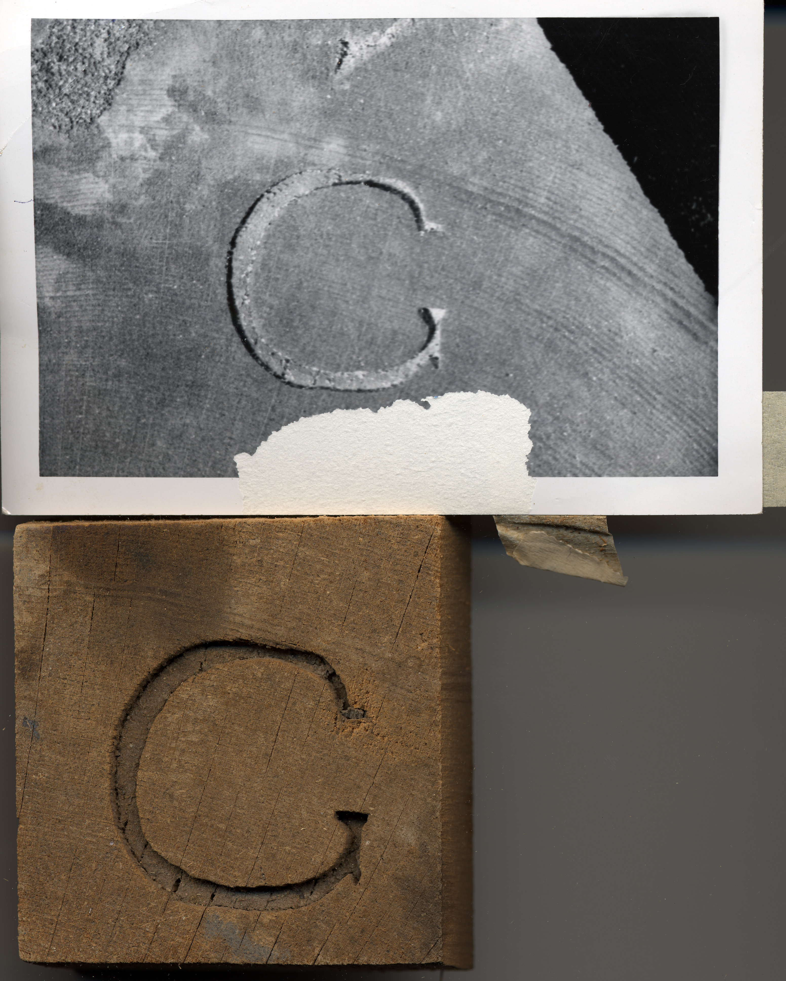 Block of wood with log brand cut from original log end.