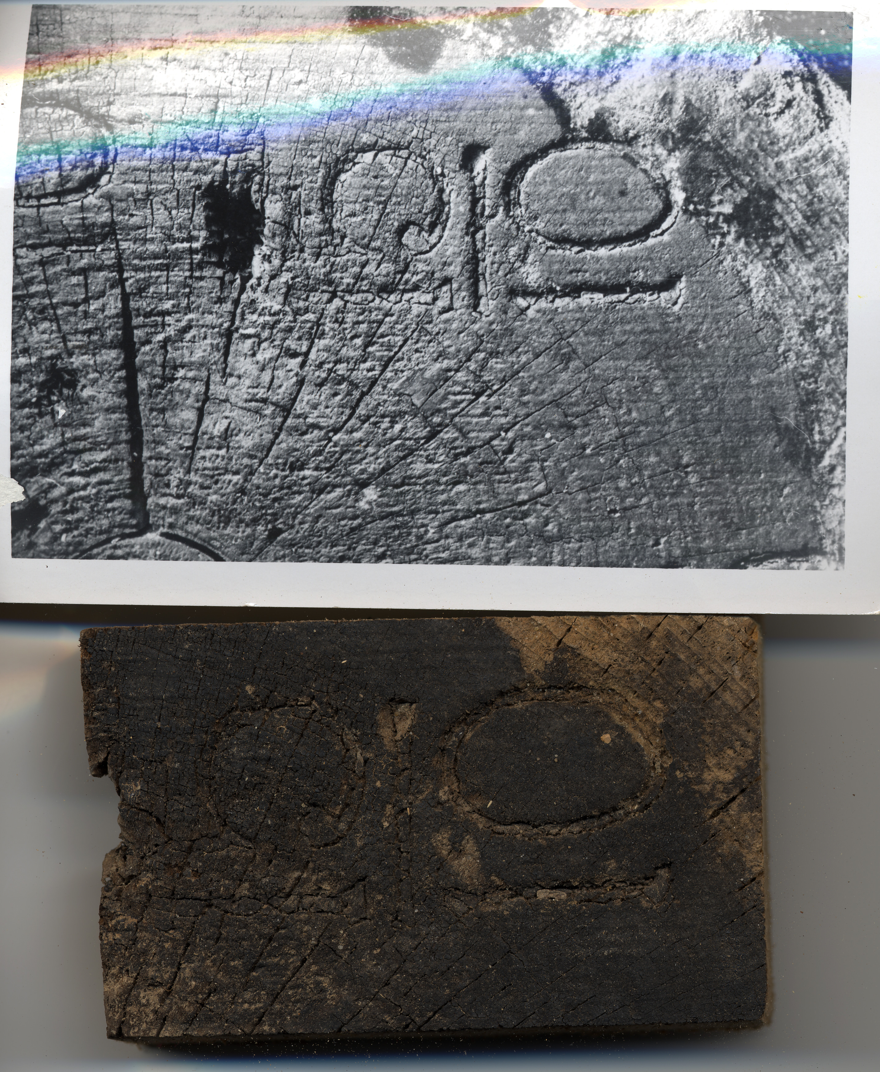 Block of wood with log brand cut from original log end.
