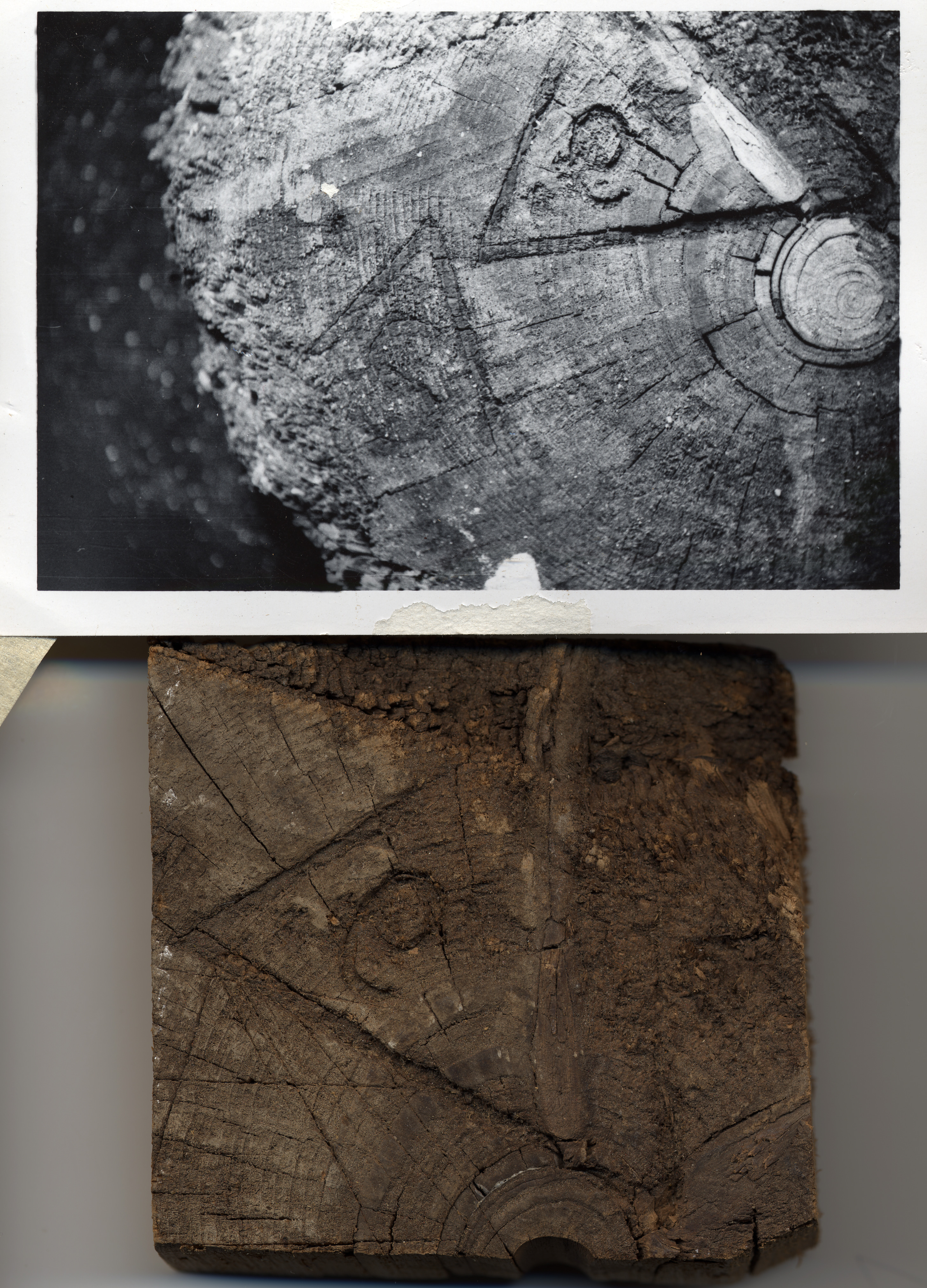 Block of wood with log brand cut from original log end.