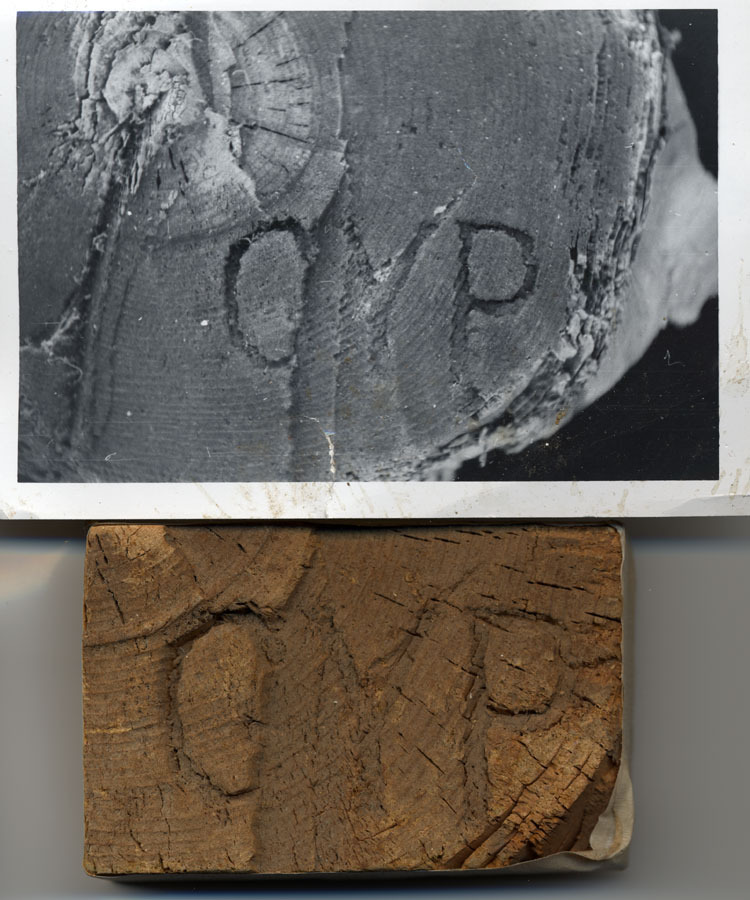 Block of wood with log brand cut from original log end.