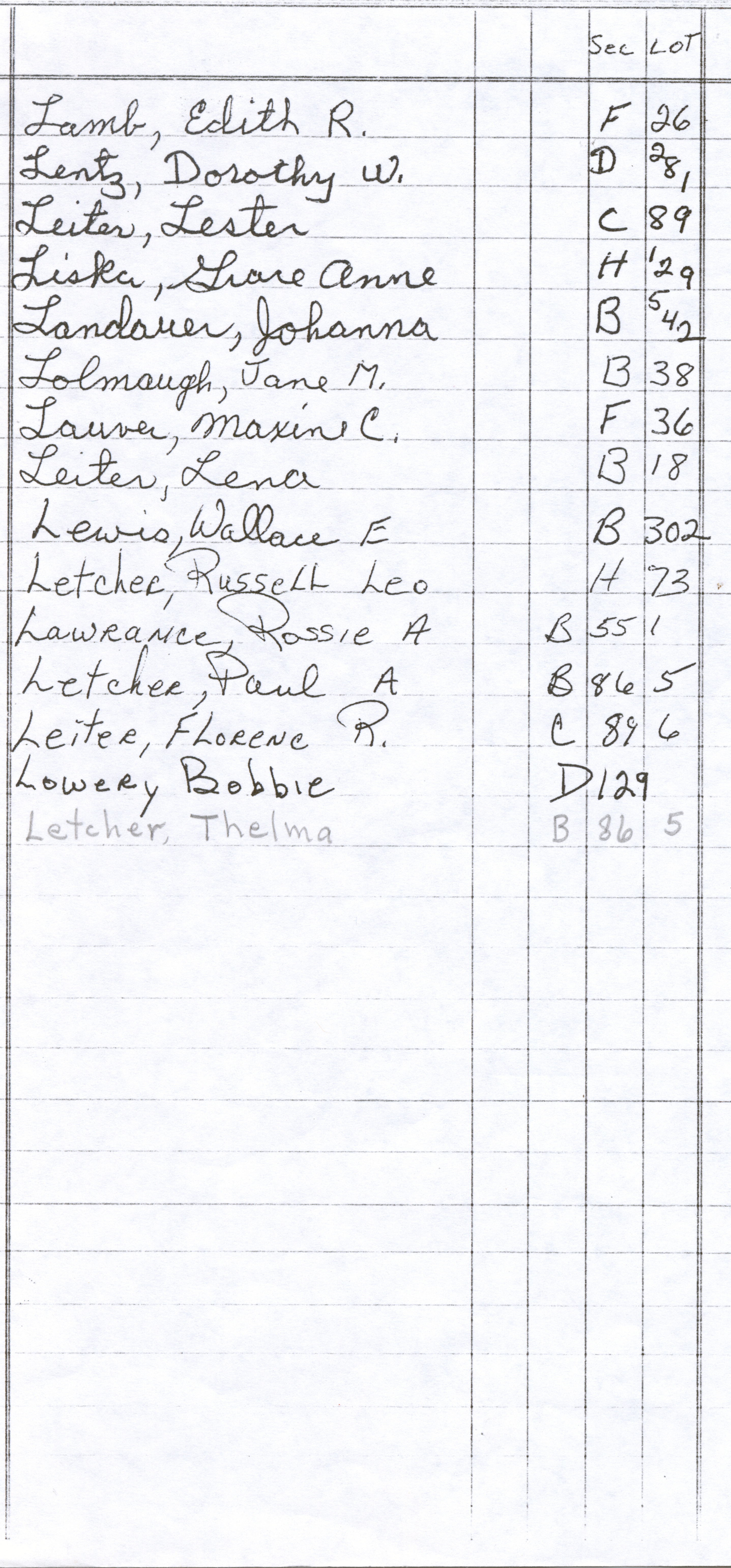 Part 1: Edith Lamb, Dorothy Lentz, Lester Leiter, Grace Liska, Johanna Landauer, Jane Lolmaugh, Maxine Lauver, Lena Leiter, Wallace Lewis, Russell Letcher, Rossie Lawrance, Paul Letcher, Florence Leiter, Bobbie Lowery, Thelma Letcher.