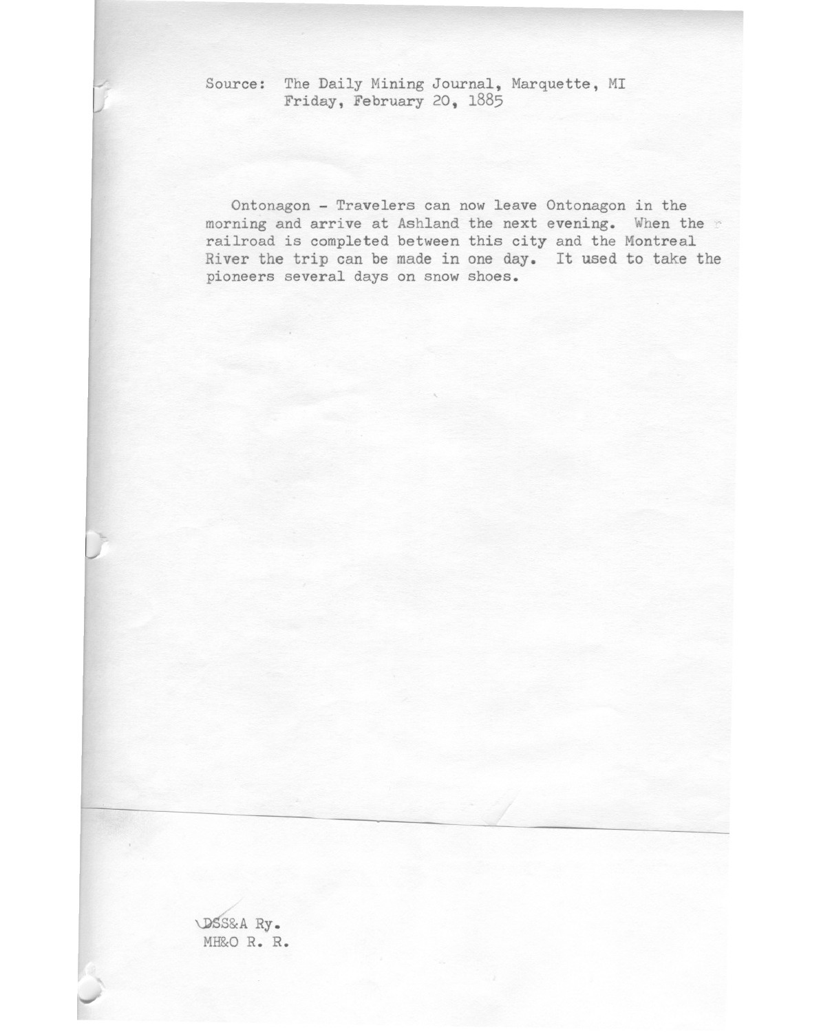 Transcription of newspaper article from the Daily Mining Journal (Marquette, Mich.), Feb. 20, 1885, regarding the trip between Ontonagon, Michigan, to Ashland, Wisconsin.