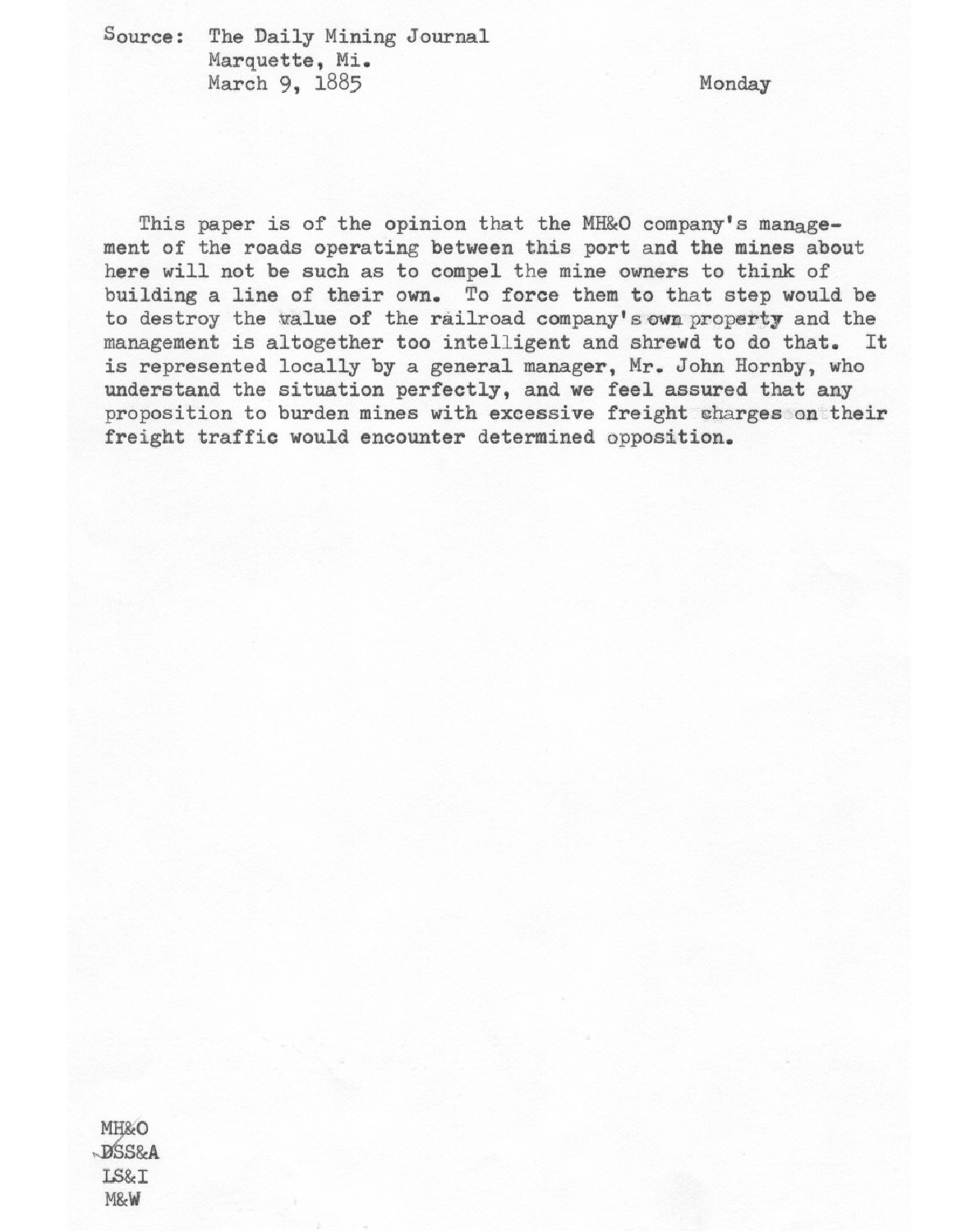 Article about the relationship between the MH&O (Marquette, Houghton, and Ontonagon) railraod company and the local mines.