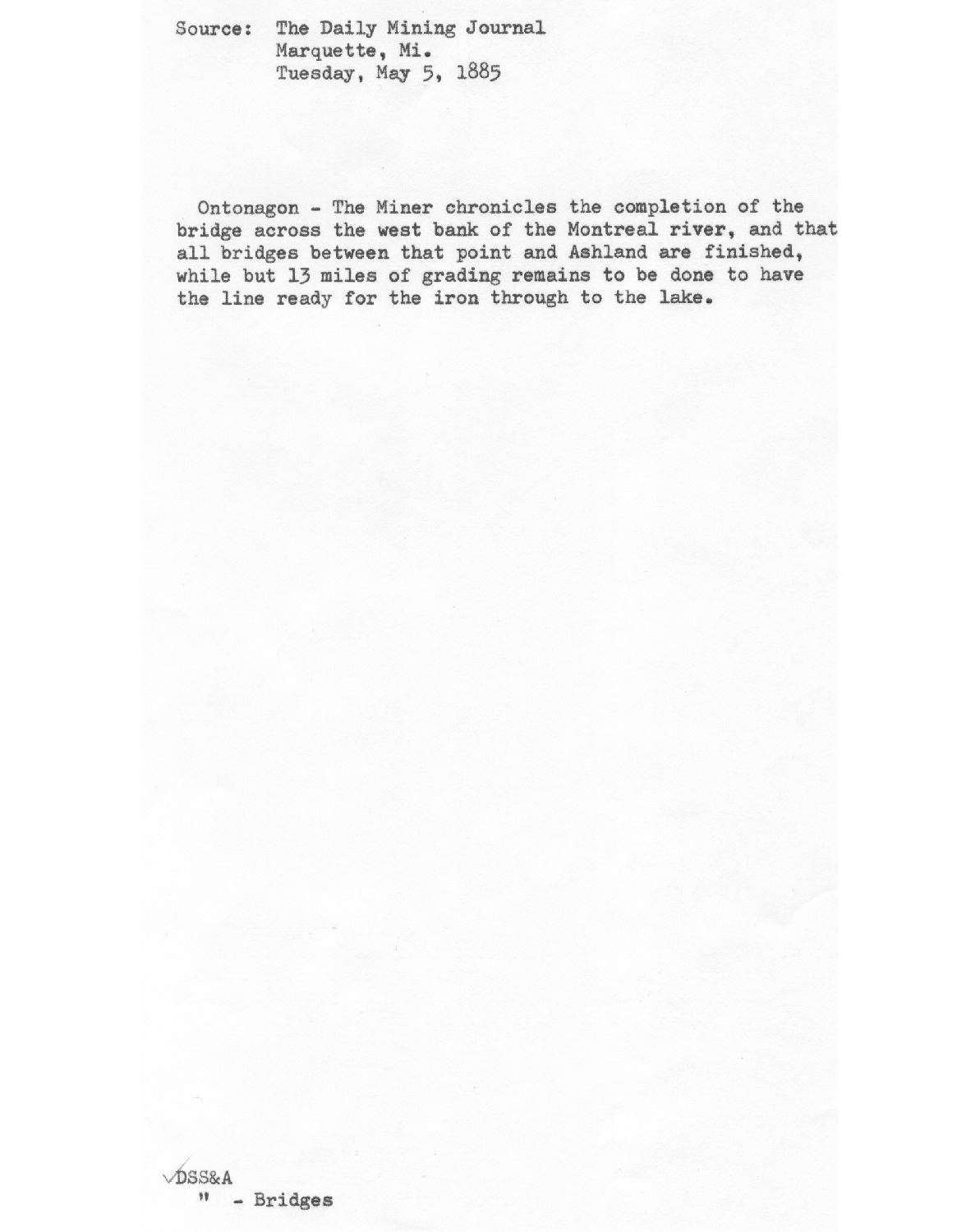 Announcement of the completion of the railroad bridge across the Montreal River near Ashland, Wisconsin, and Ontonagon, Michigan.