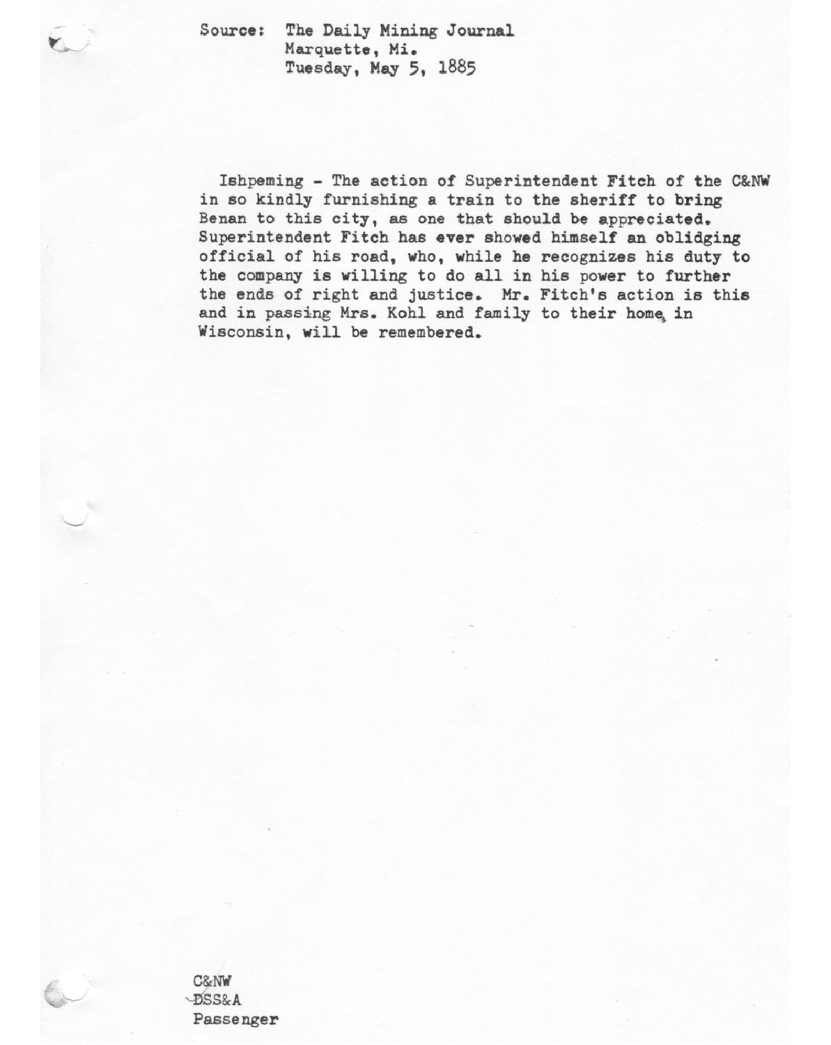 Article commending Superintendent Fitch of the Chicago and North Western Railway Company and his decision to furnish a train to the sheriff to bring Benan to Ishpeming.""