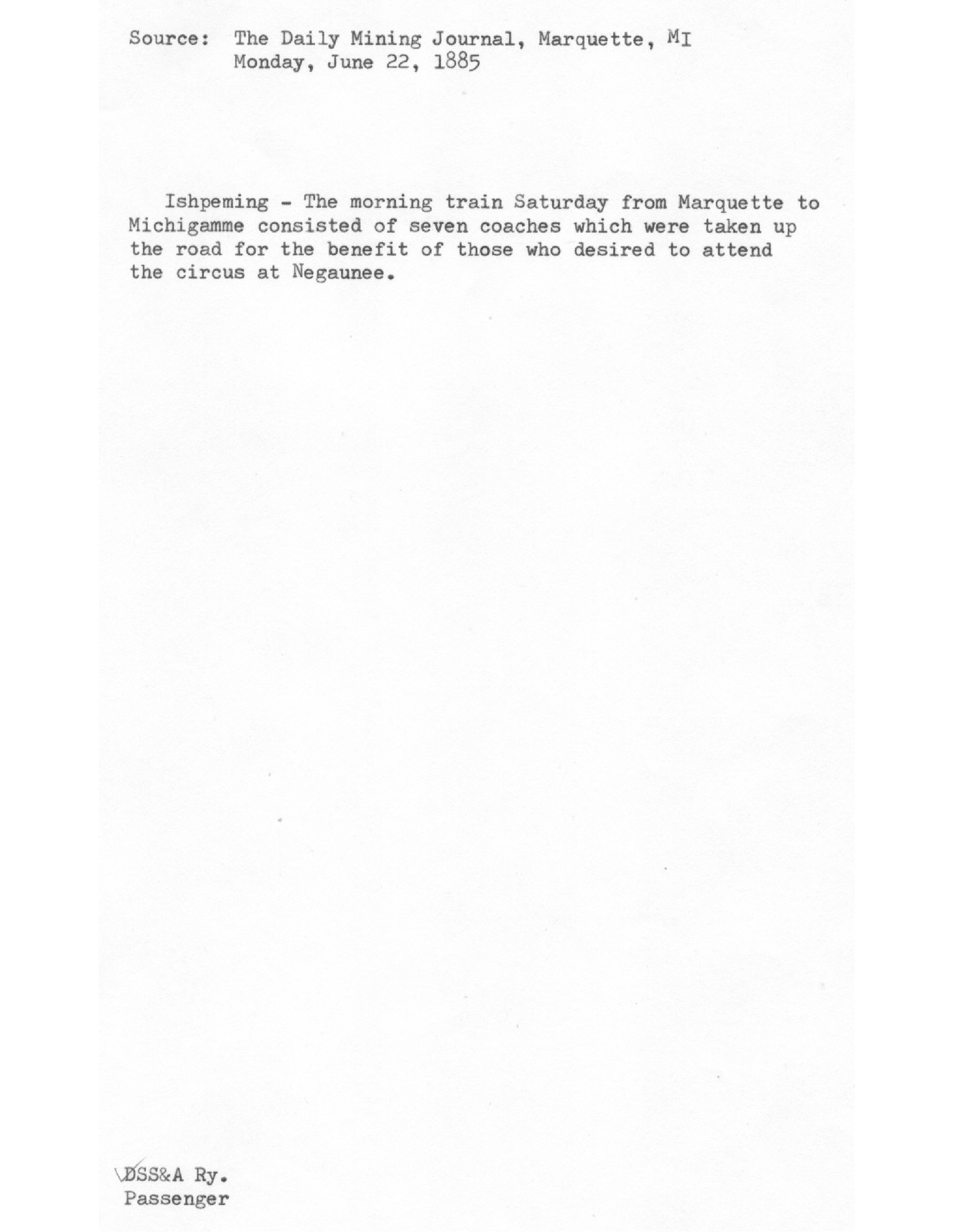 Announcement of extra train coaches from Marquette to Michigamme for those wishing to attend the circus at Negaunee.""