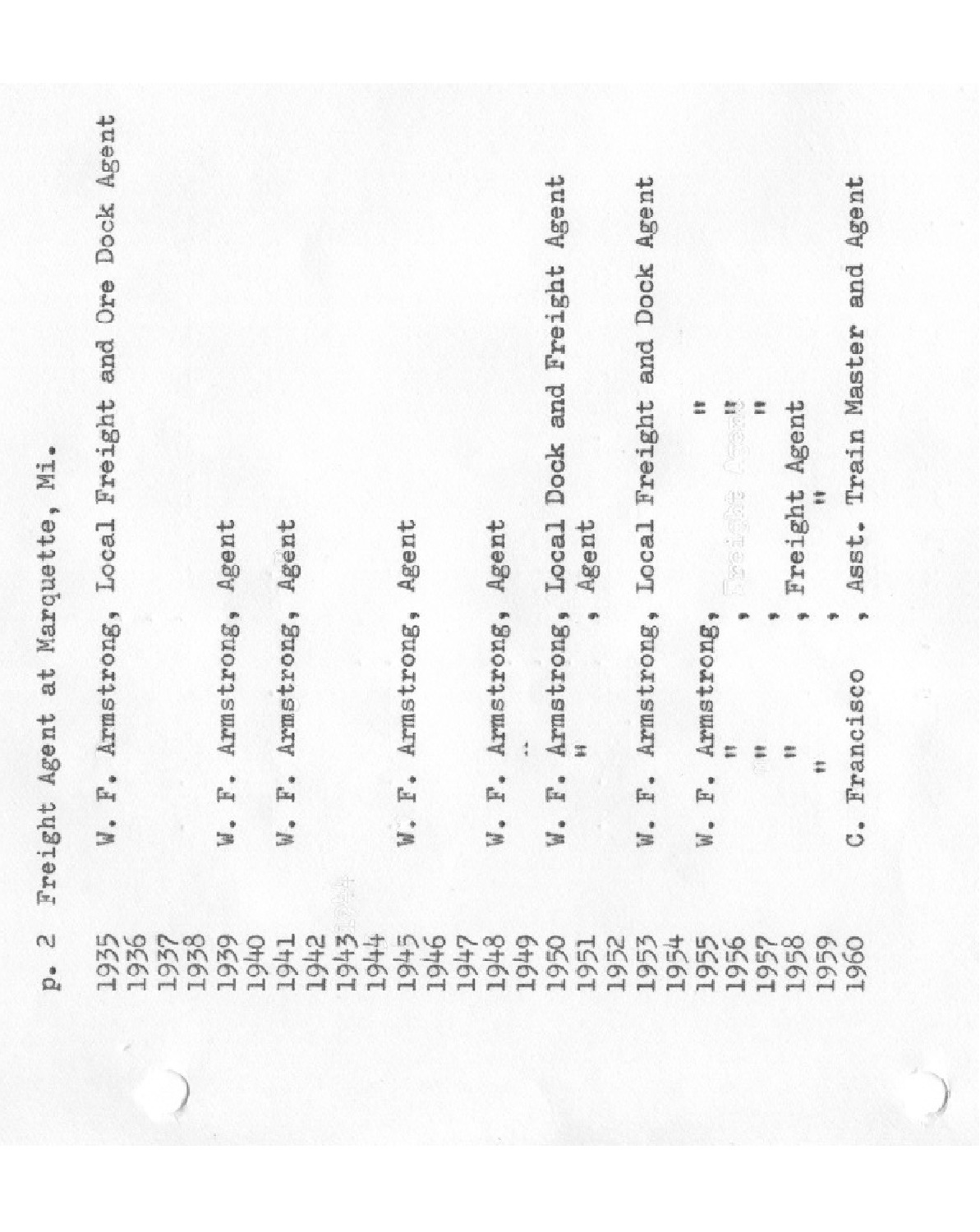 List of agents for the Duluth, South Shore, and Atlantic Railway Company (DSS&A) in Marquette, Michigan, from 1886-1960. Names include: J. M. Williams, Joseph A. Otterson, Martin Gorman, Bert Hixon, Sam Peck, C. M. Garmon, Clarence M. Gormon, W. F. Armstrong, C. Francisco.