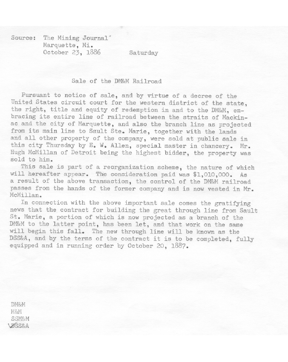 Article announcing the sale of the Detroit, Mackinac & Marquette Railroad Company (DM&MRR) to Hugh McMillan of Detroit. The line will then be known as Duluth, South Shore, and Atlantic Railway Company (DSS&A).