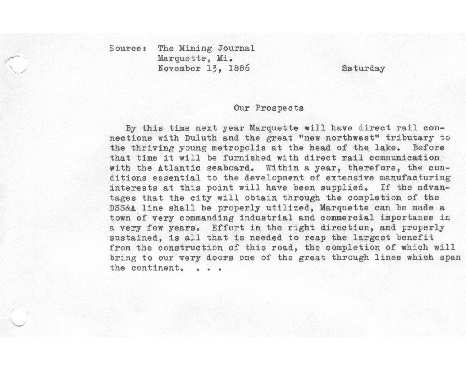 Article about the effect the railroad expansion will have on Marquette, Michigan.