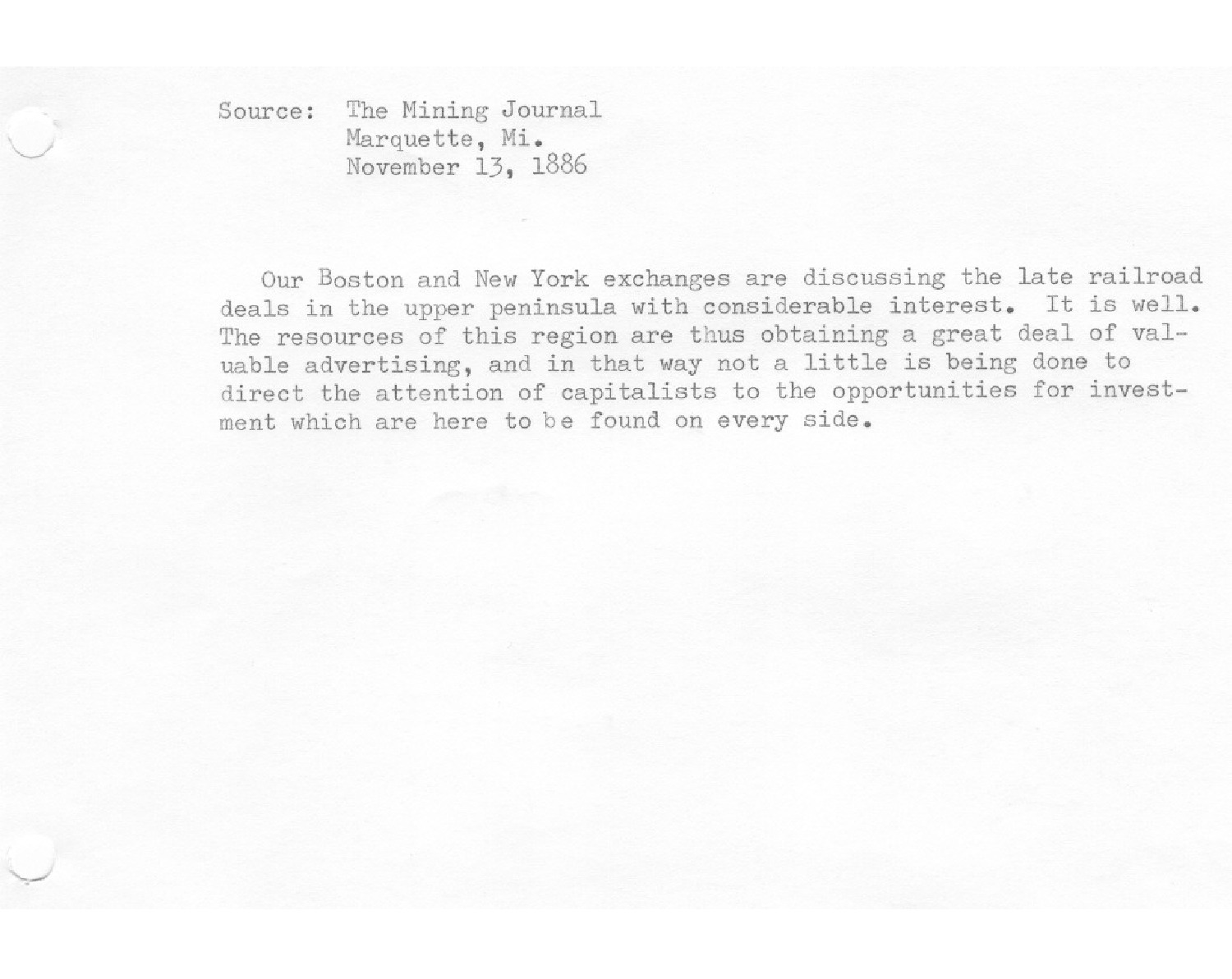 Article about the publicity of the railroad expansion in the Upper Peninsula of Michigan.