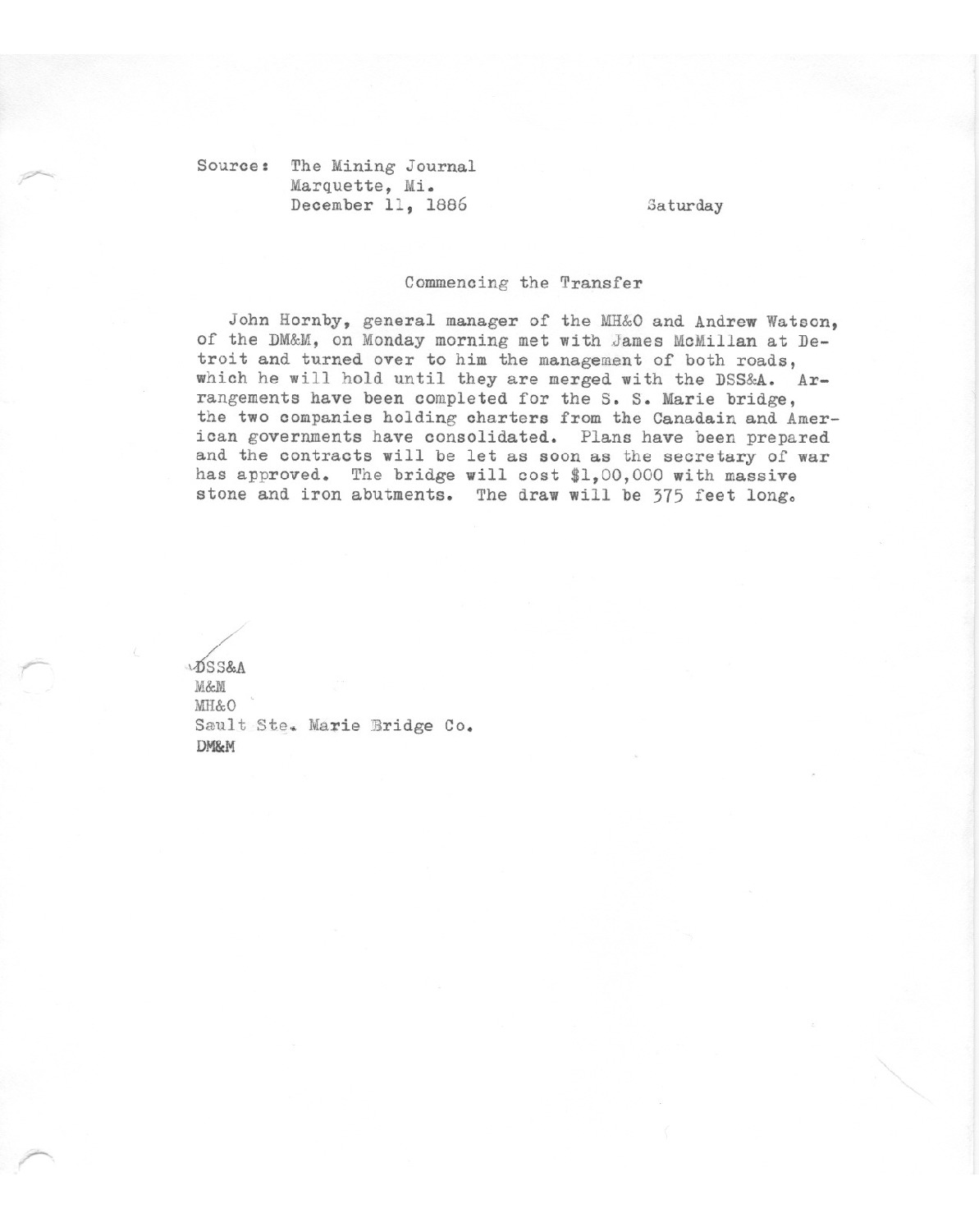 John Hornby, general manager of the MH&O and Andrew Watson, of the DM&M on Monday morning met James McMillan at Detroit and turned over to him the management of both roads, which he will hold until they are merged with the DSS&A.