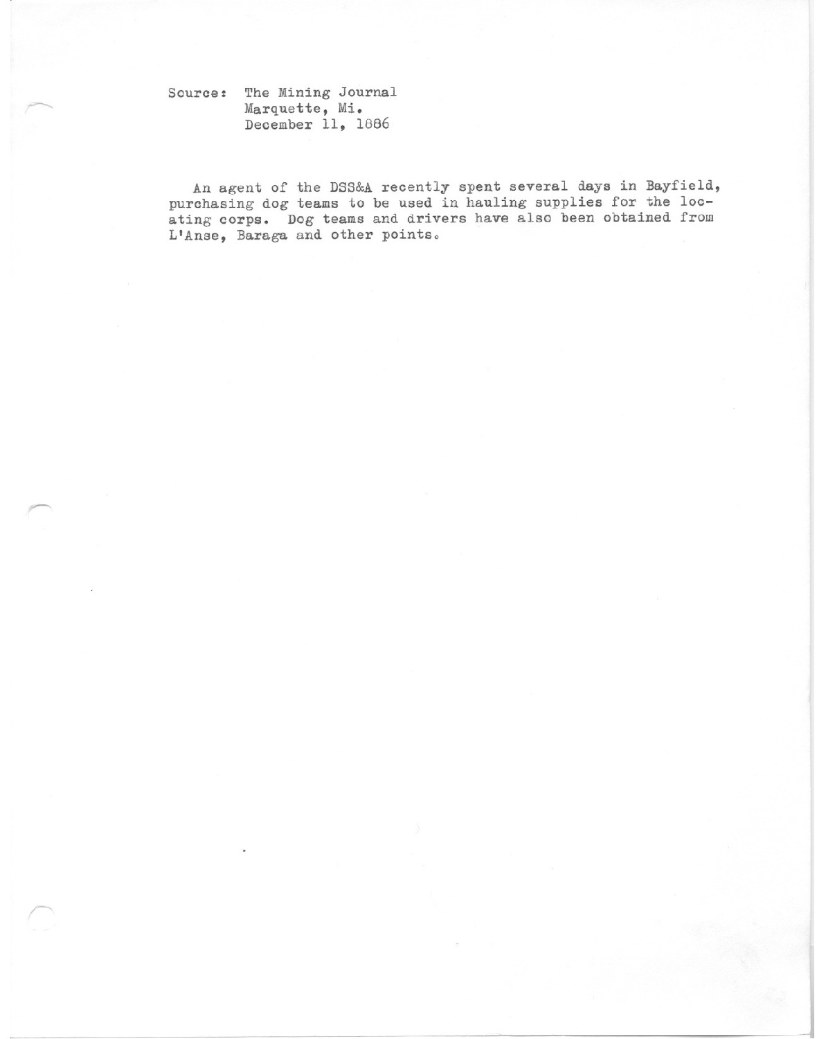 An agent for the DSS&A recently spent several days in Bayfield, purchasing dog teams to be used in hauling supplies for the locating corps. Dog teams and drivers have also been obtained from L'Anse, Baraga and other points.