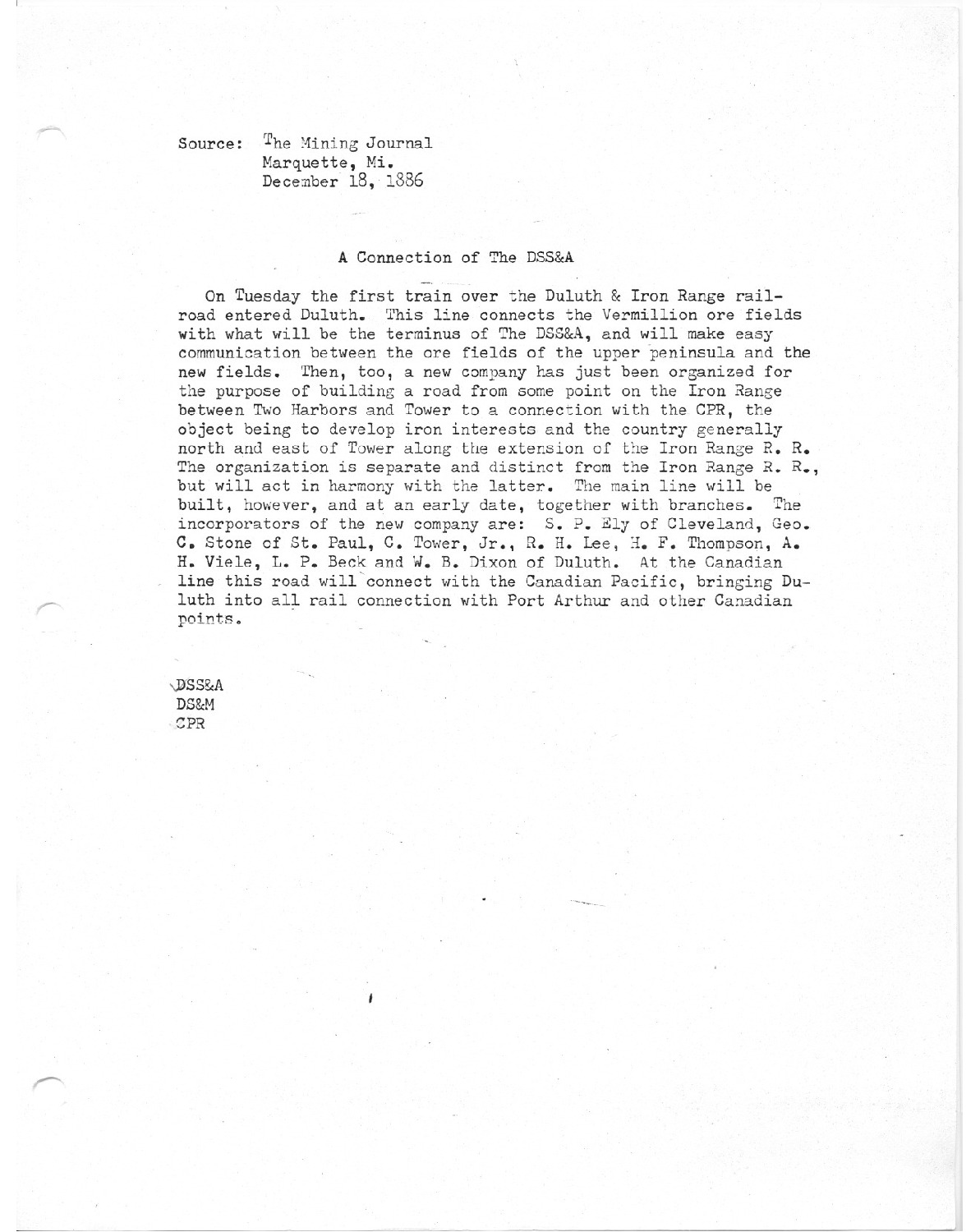 On Tuesday the first train over the Duluth & Iron Range railorad entered Duluth. This line connects the Vermillion ore fields with what will be the terminus of the DSS&A, and will make easy communication between the ore fields of the Upper Peninsula and the new fields.