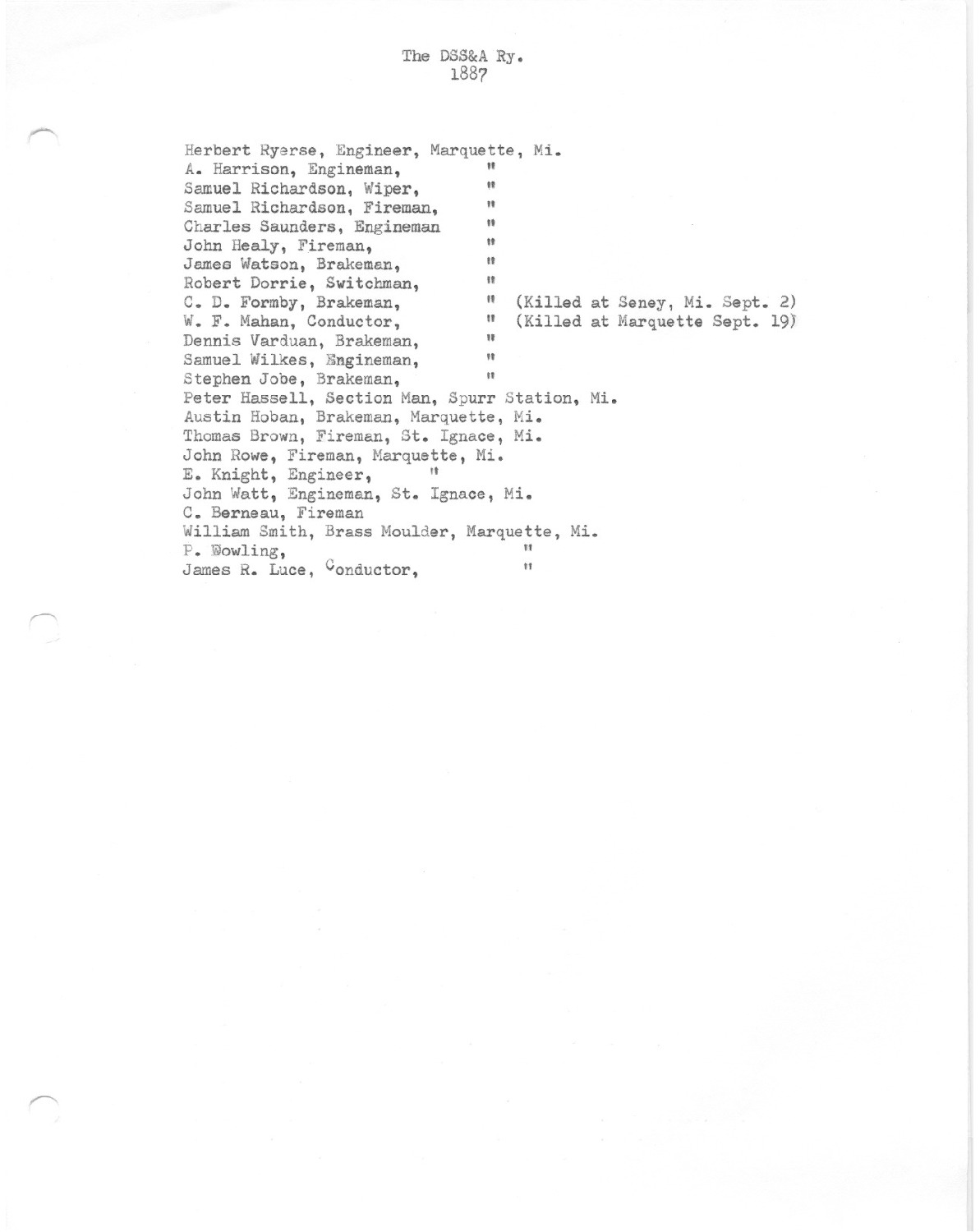 DSS&A Employee Listing of Engineers, Brakeman, Fireman, Conductor and Section Man. Including 1 breakman and 1 conductor killed on September 2 and September 19th of 1887.