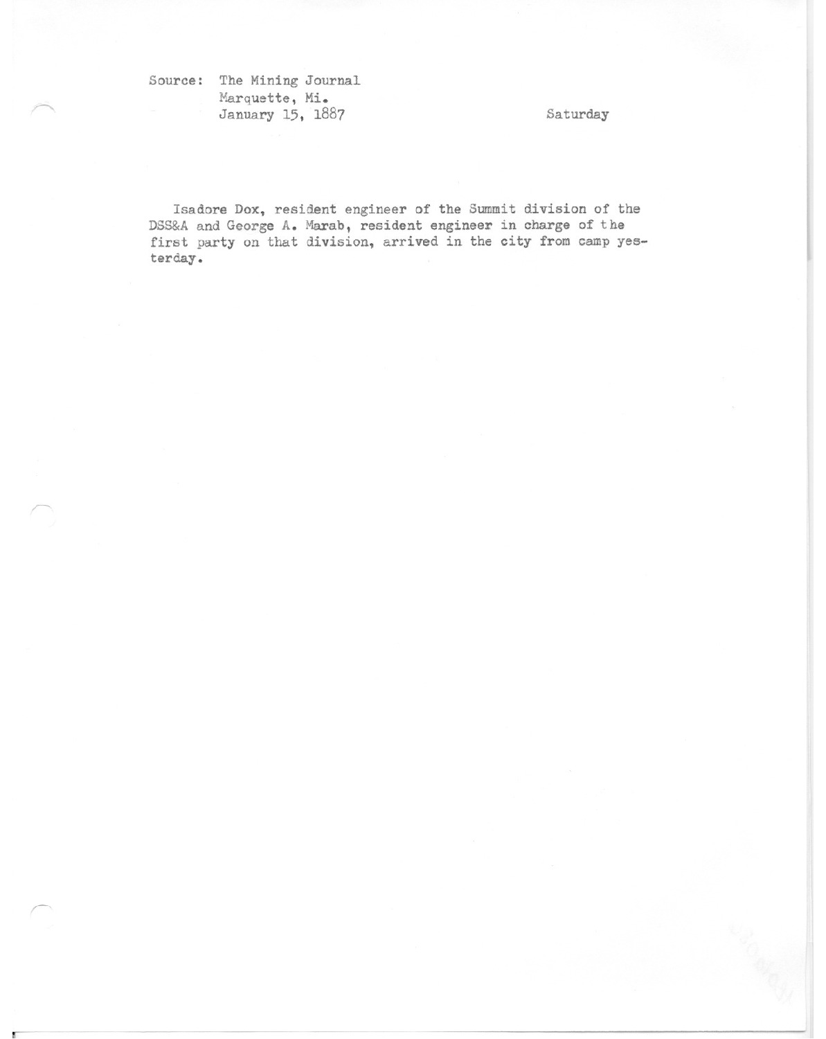 Isadore Dox, resident engineer of the Summit division of the DSS&A and George A. Marab, resident engineer in charge of the first party on that division, arrived in the city from camp yesterday