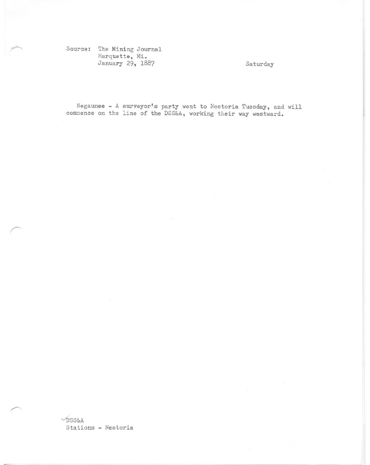 Negaunee A surveyor's party went to Nestoria Tuesday, and will commence on the line of the DSS&A, working their way westward.