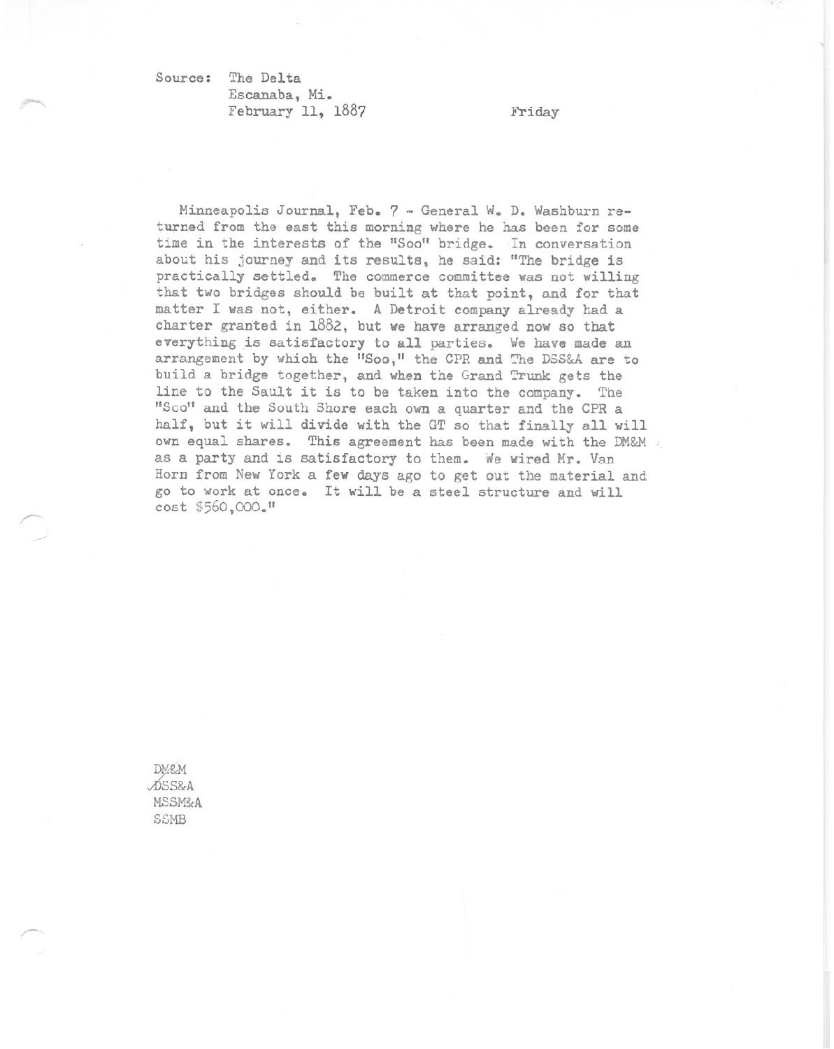 General W. D. Washburn returned from the east this morning where he has been for some time in the interests of the Soo bridge. In conversation about his journey and its results, he said: the bridge is practically settled. The commerce committee was not willing that two bridges should be built at that point, and for that charter granted in 1882."" ""