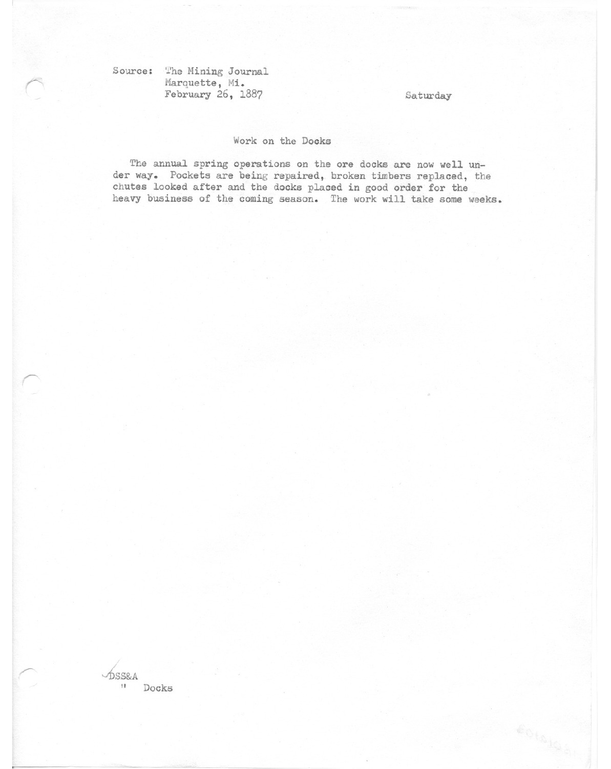Annual spring operations on the ore docks are now well under way. Pockets are being repaired, broken timbers replaced, the chutes looked after, and the docks placed in good order fore the heavy business of the coming season. The work will take some weeks.