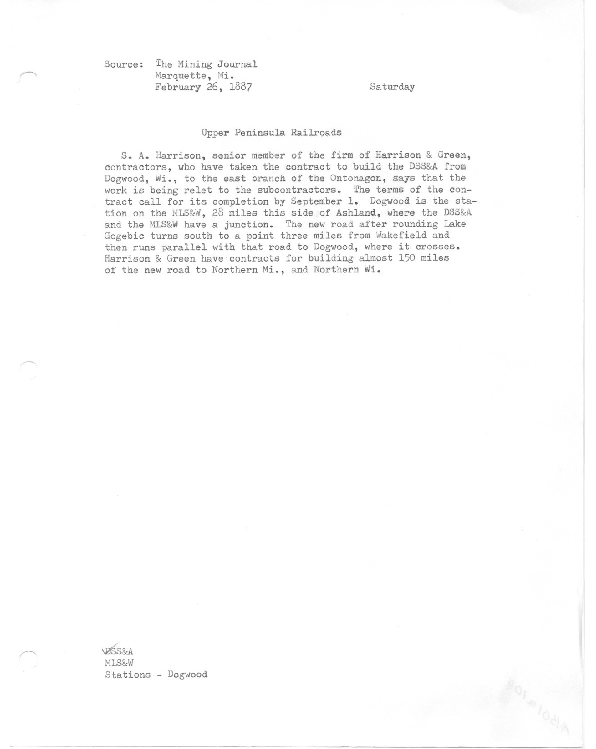 S.A. Harrison senior member of the firm of Harrison & Green, contractors, who have taken the contract to build the DSS&A from Dogwood, Wi., to the east branch of the Ontonago, says that the work is being relet to the subcontractors.