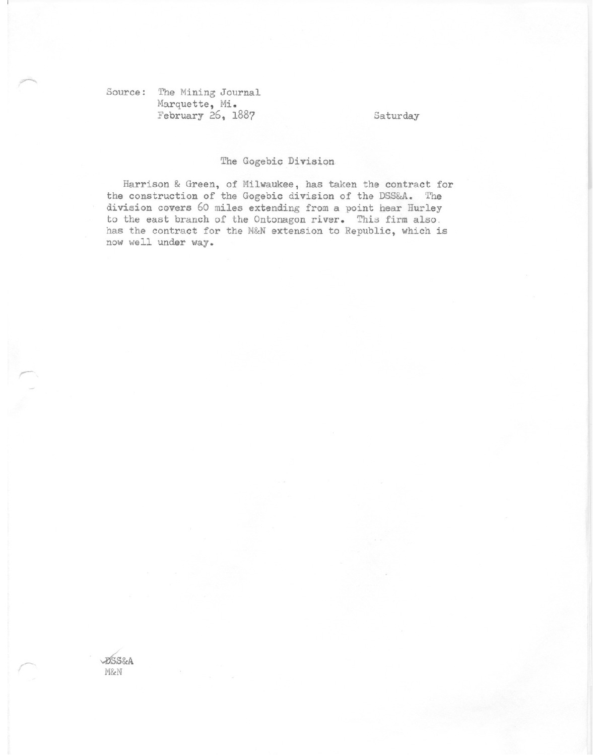 Harrison & Green, of Milwaukee, has taken the contract for the construction of the Gogebic division of the DSS&A. The division covers 60 miles etending from a point near Hurley to the east branch of the Ontonagon river. This firm also has the contract for the M&n extension to Republic, which is now well under way.