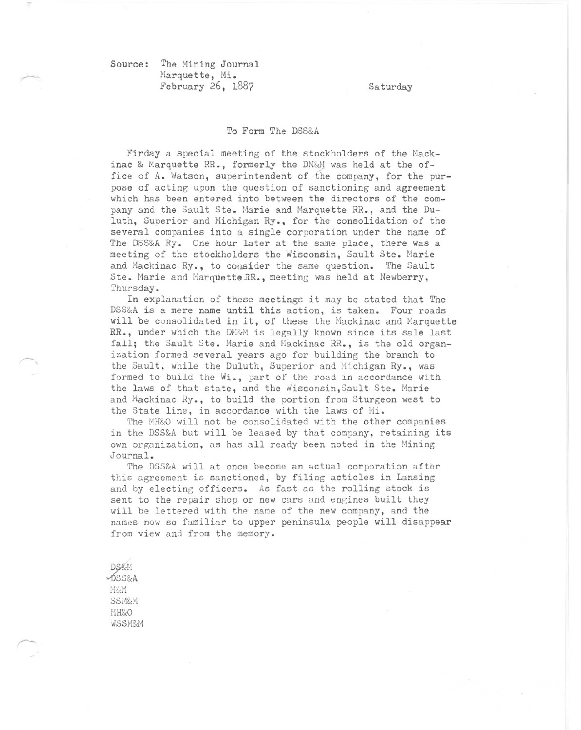 Friday a special meeting of the stockholders of the Mackinac & Marquette RR., formerly the DM&M was held at the office of A. Watson, superintendent of the company.