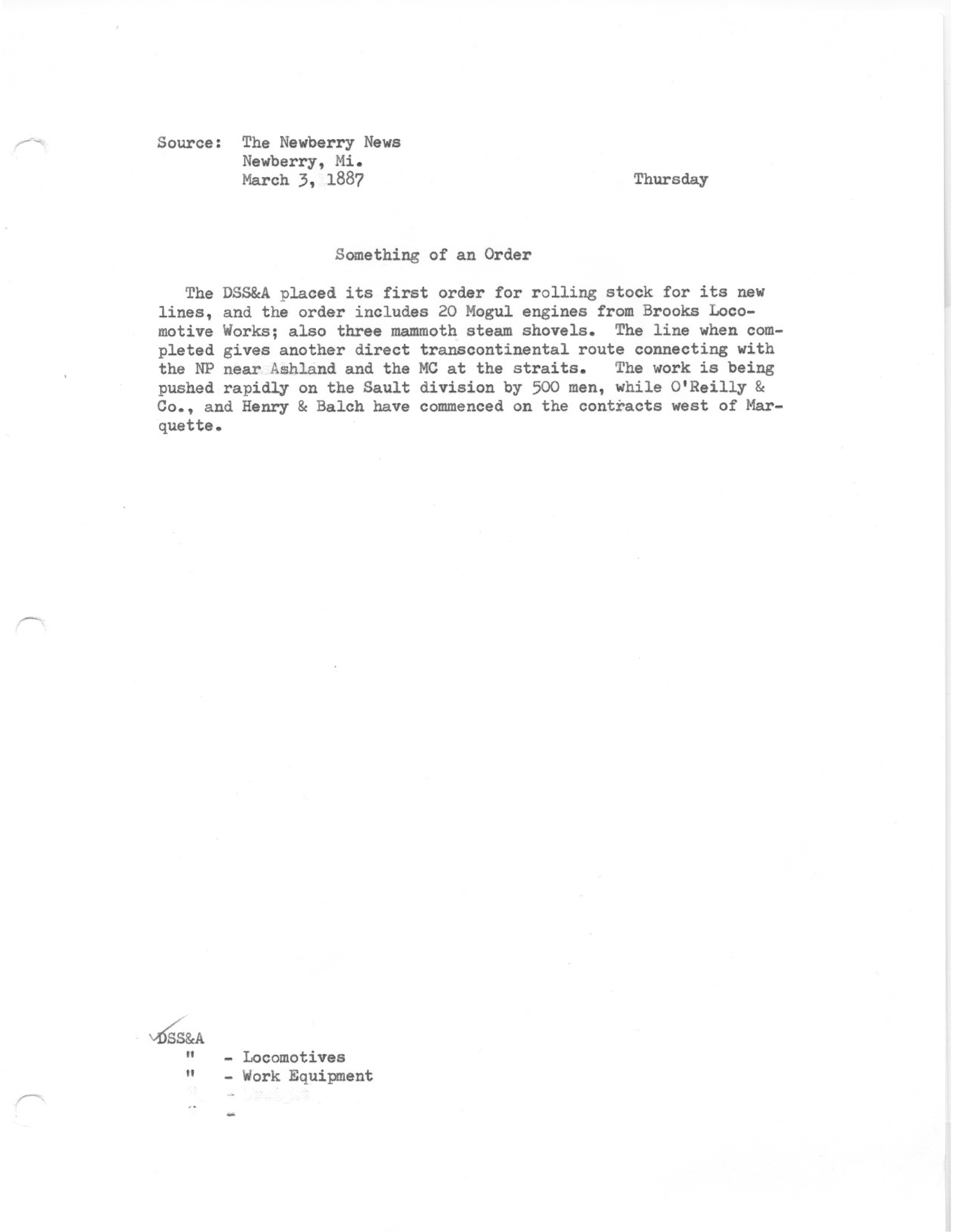 DSS&A placed its first order for rollling stock for its new lines, and the order includes 20 Mogul engines from Brooks Locomotive Works.