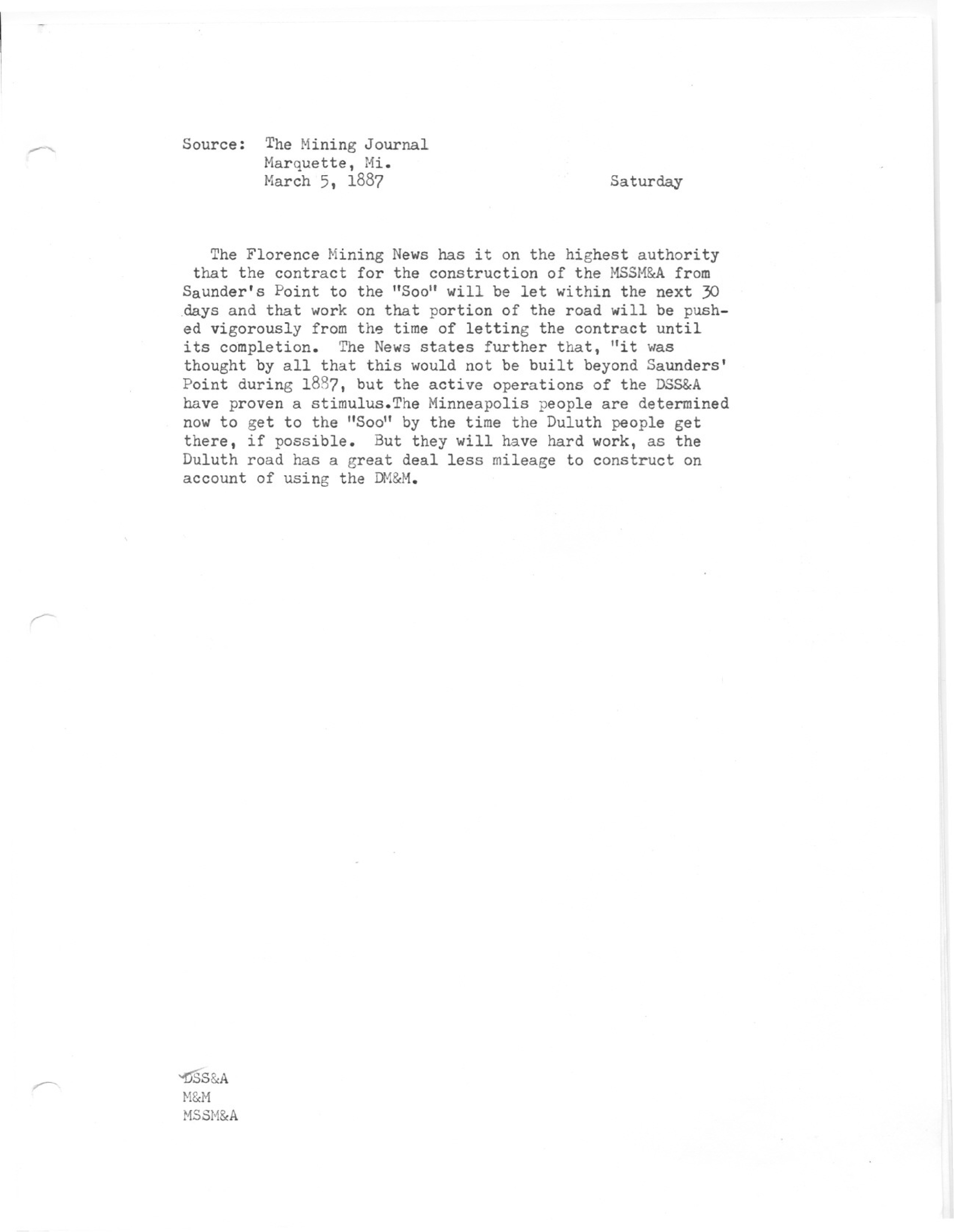 Florence Mining News has it on the highest authority that the contract for the construction of the MSSM&A from Saunder's Point to the Soo will be let within the next 30 days and the work on that portion of the road will be pushed vigorously from the time of letting the contract until its completion.